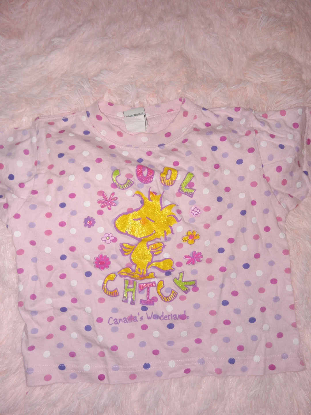 This adorable Canada's Wonderland shirt is perfect for your little one! It's a size 4T and made of 100% cotton. The shirt features a cute polka dot pattern and a fun design with Woodstock. It's been gently used and is in great condition!