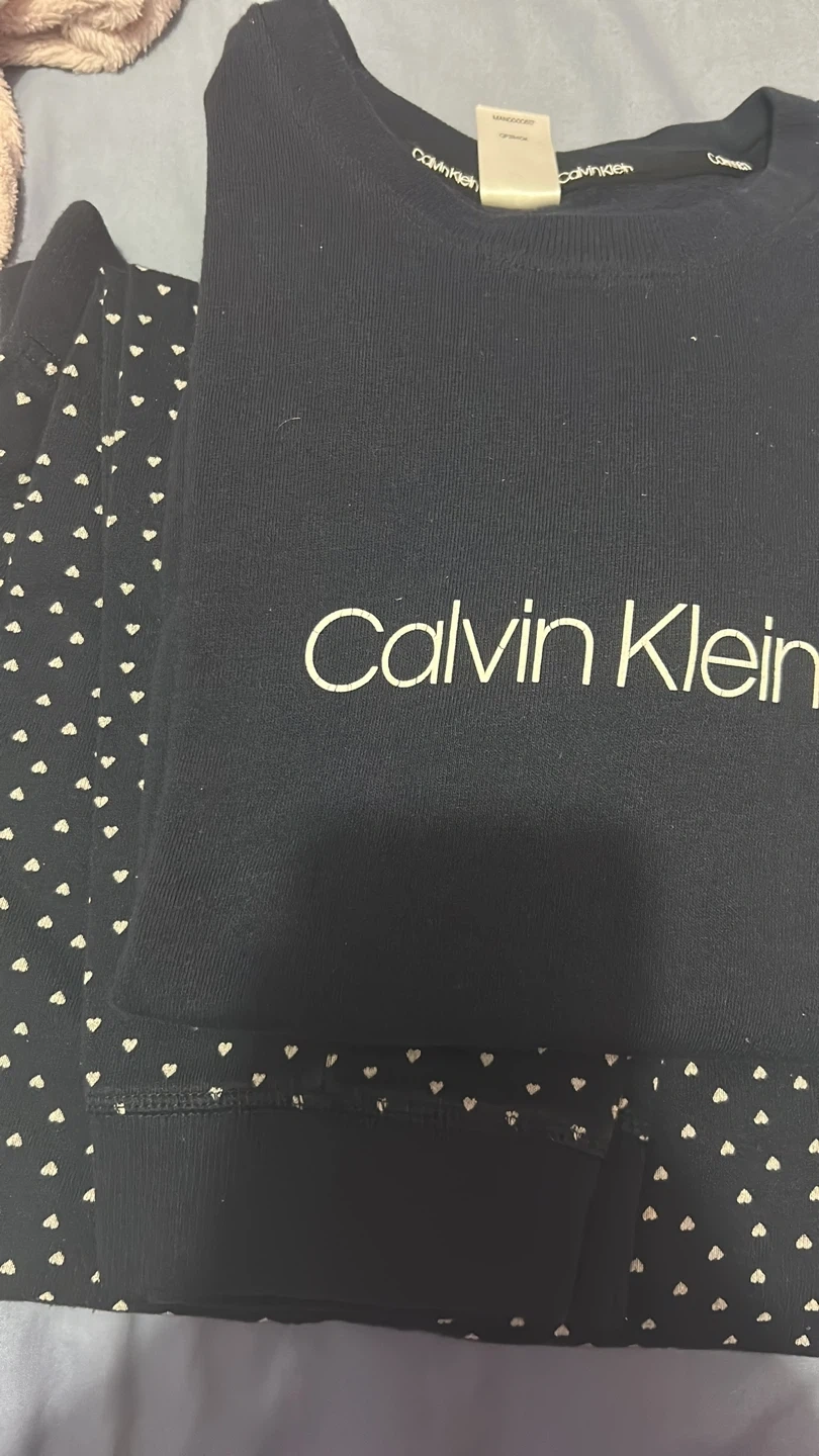 Selling a Calvin Klein pajama set! It's black with a cute heart pattern on the bottoms. The top has the Calvin Klein logo across the chest. Perfect for cozy nights!