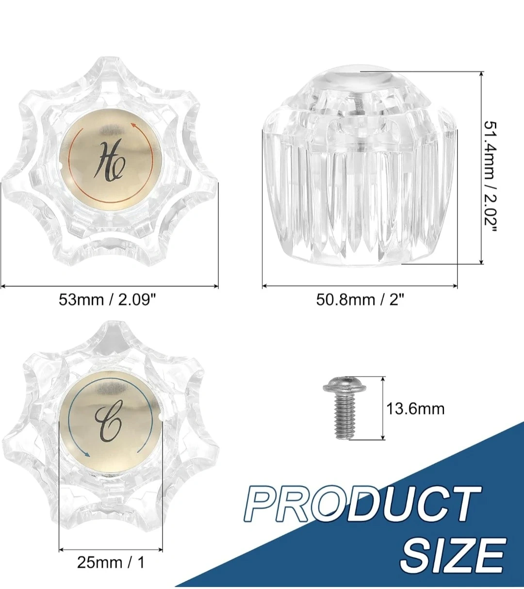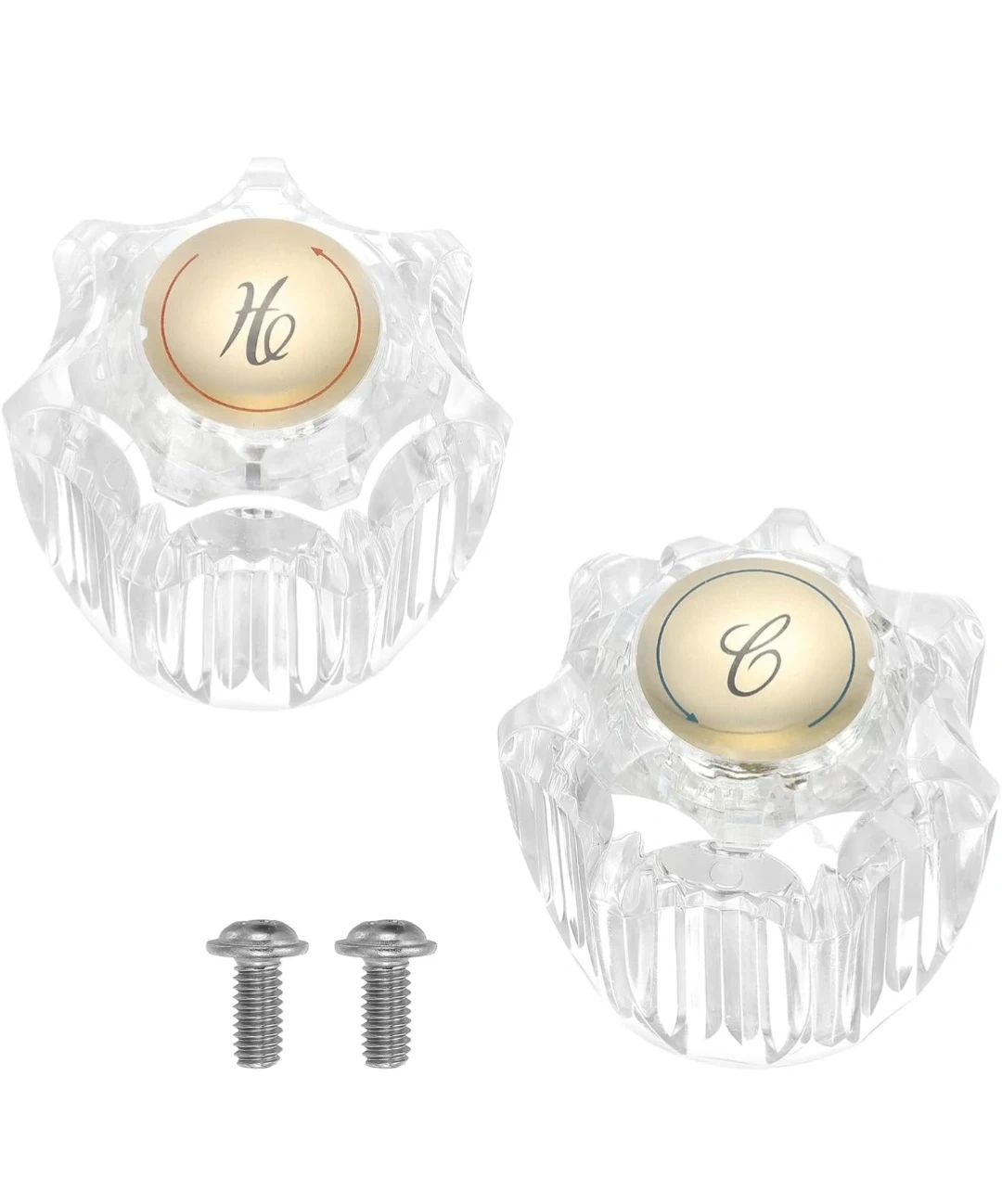 These clear acrylic faucet handles are designed for hot and cold water applications. They come with screws for easy installation. Each handle features a distinct 'H' or 'C' marking for hot and cold identification. Made from durable acrylic.