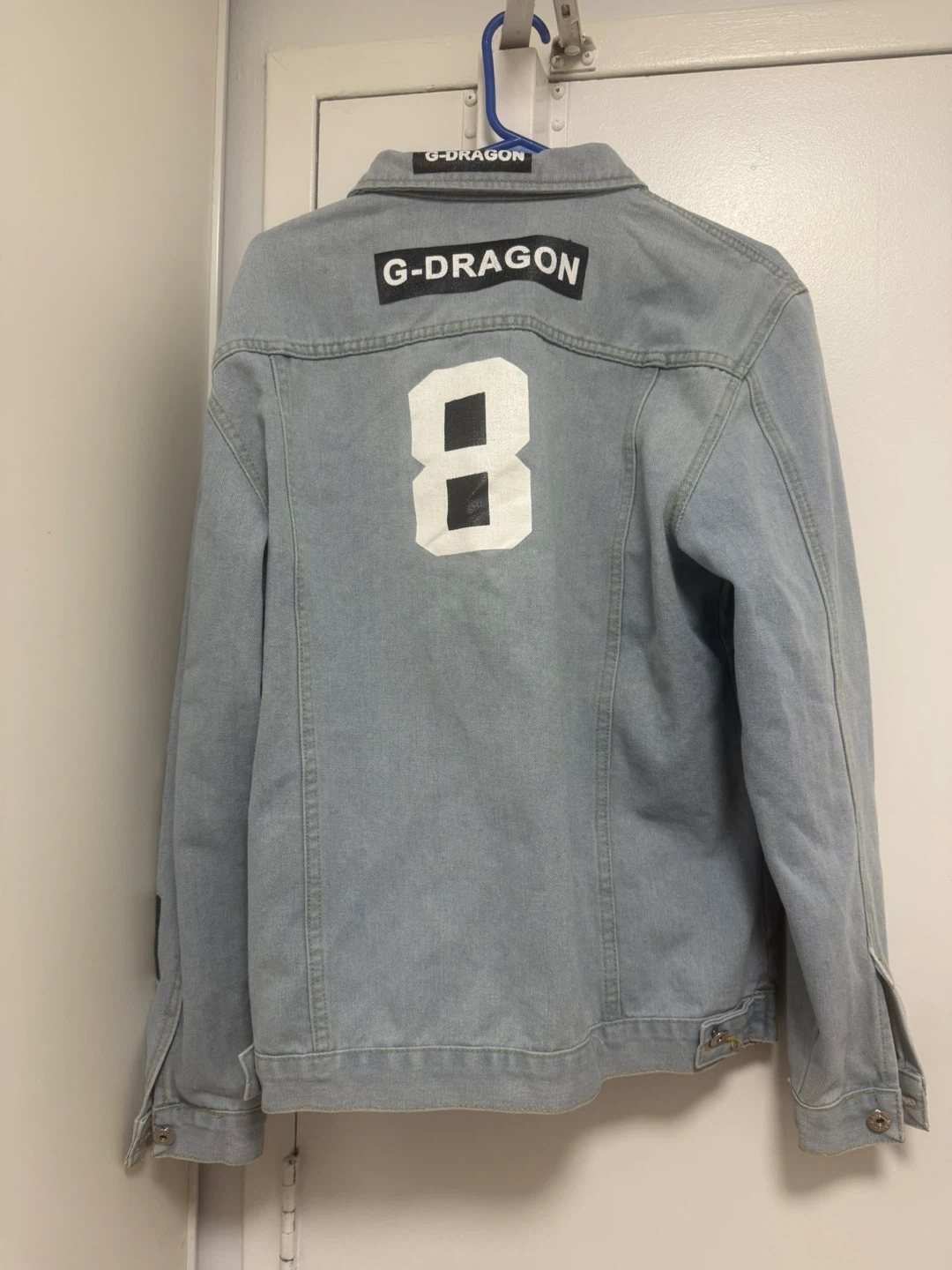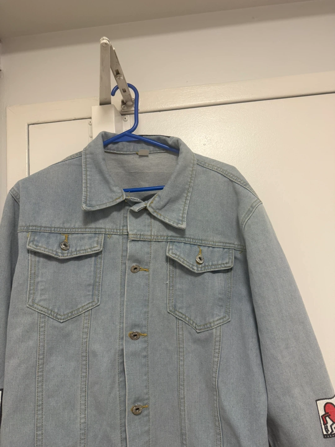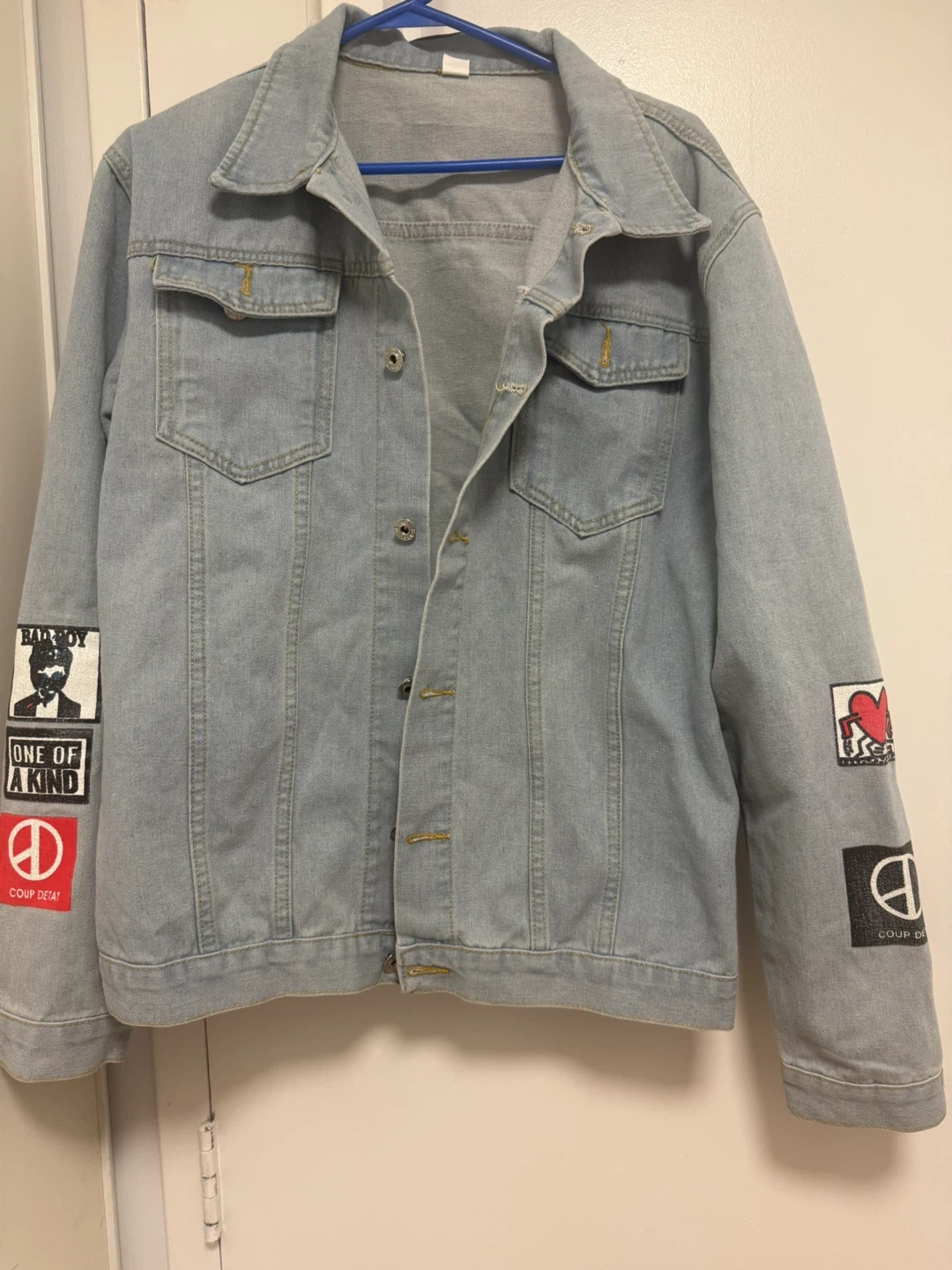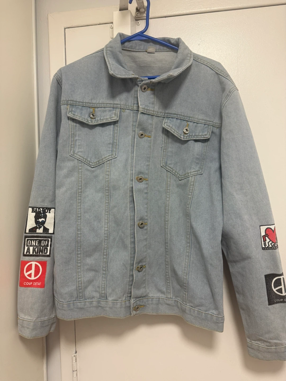 Here's a light blue denim jacket in size 4XL! It has some unique patches on the sleeves and back, adding a bit of personality to the classic denim look