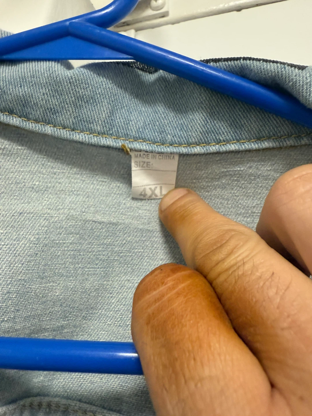 Here's a light blue denim jacket in size 4XL! It has some unique patches on the sleeves and back, adding a bit of personality to the classic denim look