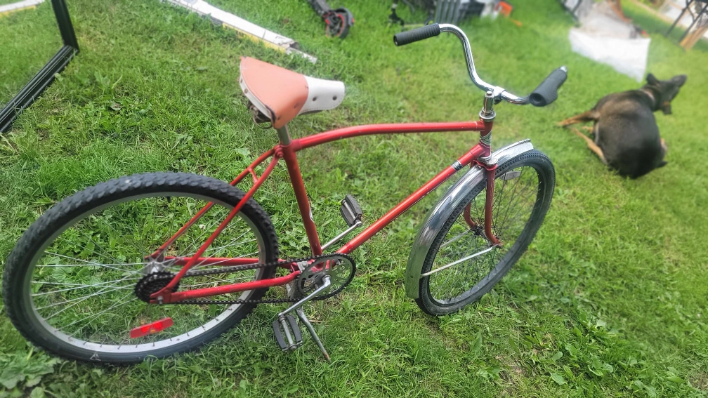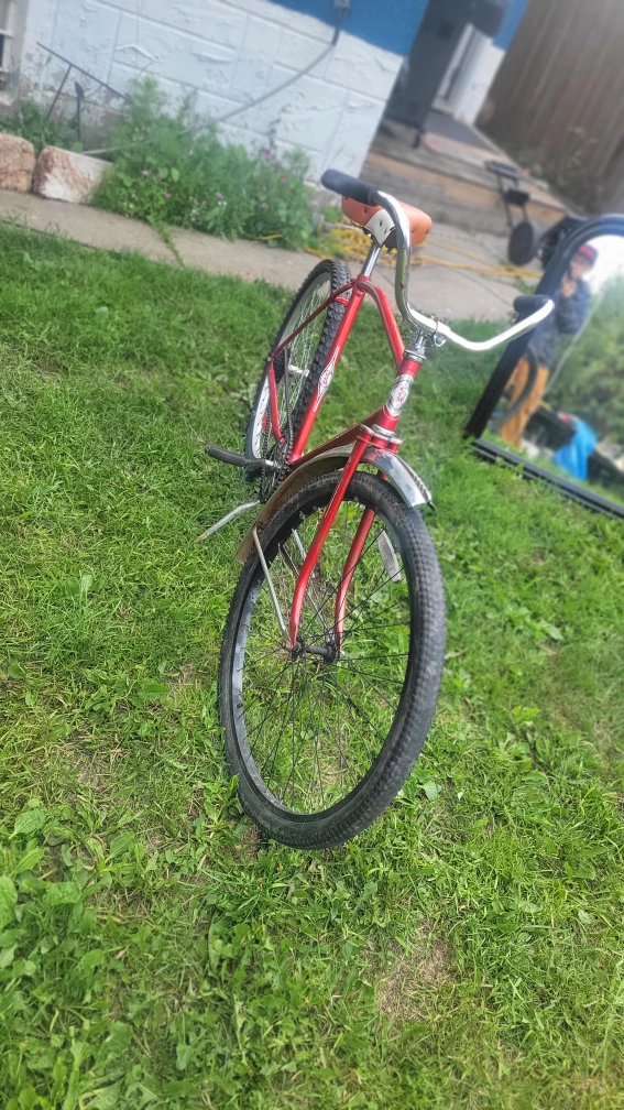 Selling a vintage red bicycle. It's in good condition and ready to ride! Great for cruising around town or enjoying a leisurely ride in the park. All original parts however it does need a break installed.