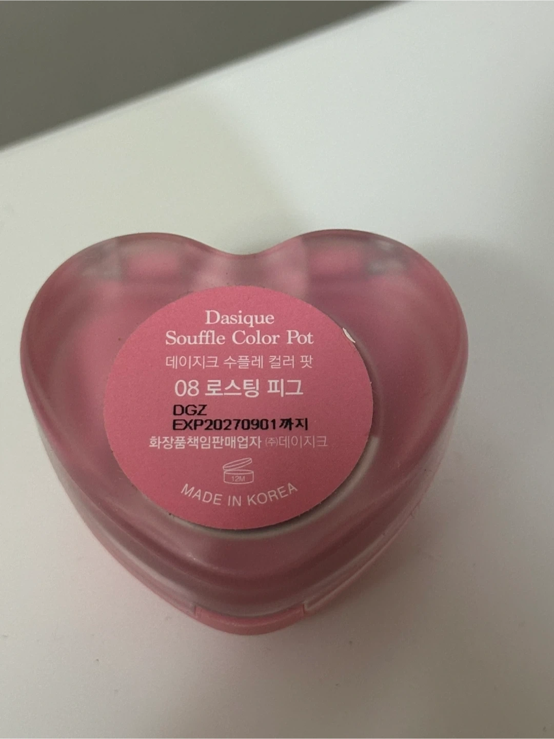 Dasique Souffle Color Pot in shade 08 Rosting Fig. This comes with a small brush applicator. The expiry date is in 2027. It's a lovely pink heart-shaped compact. Used once