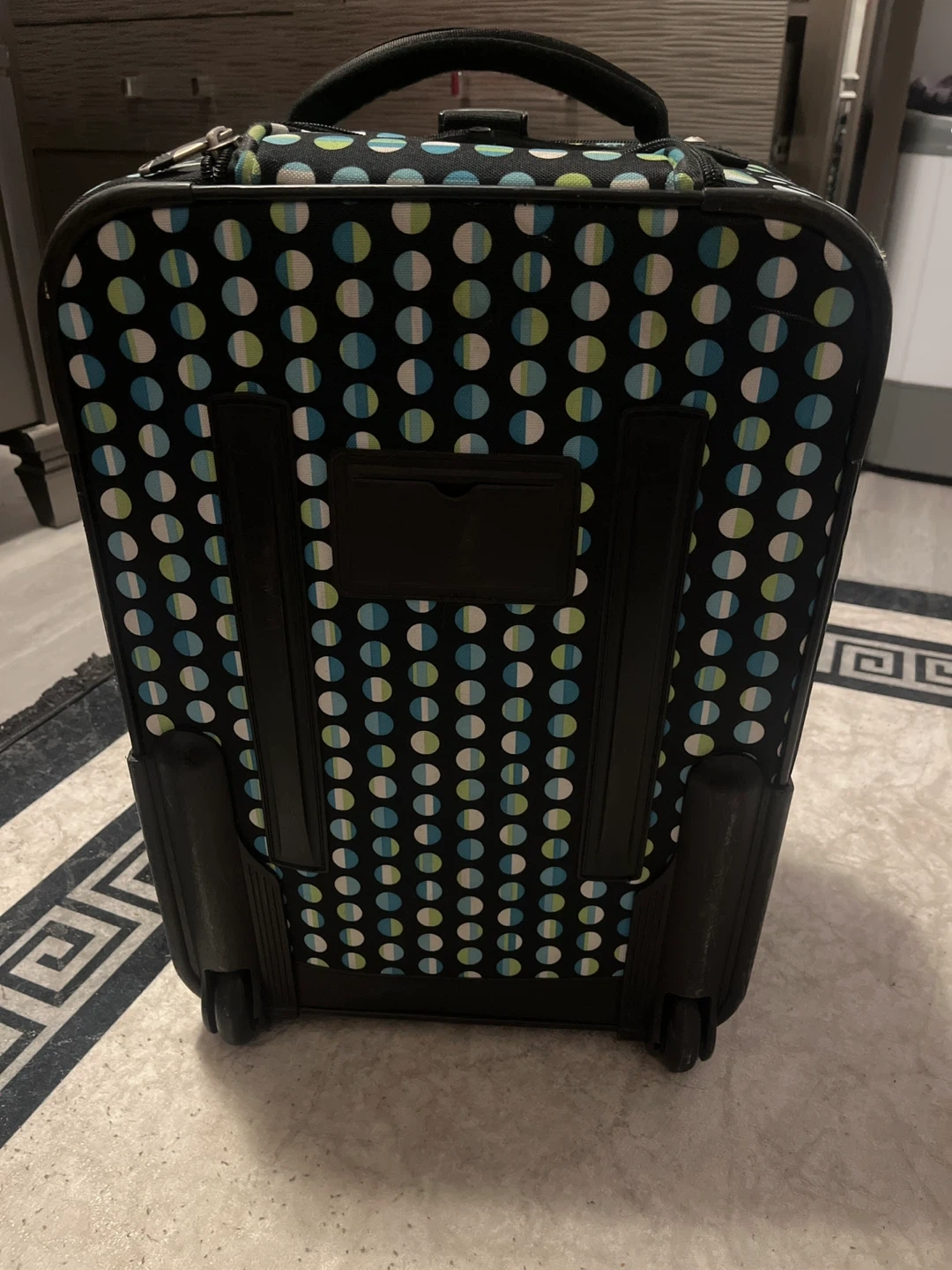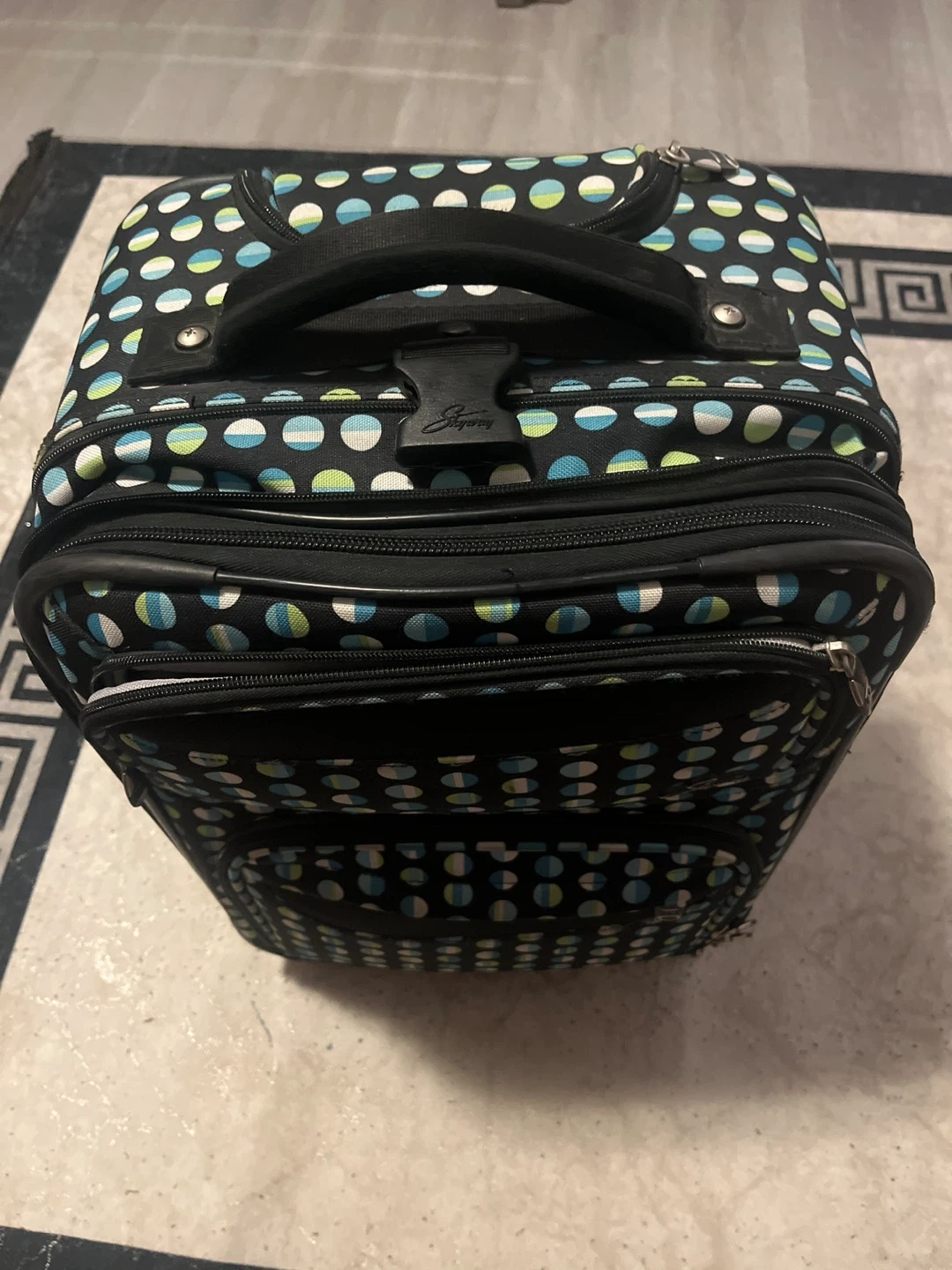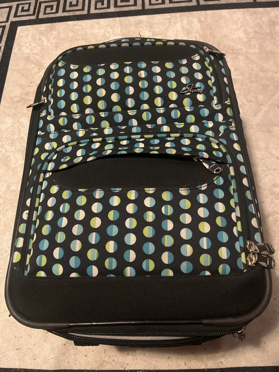 This Skyway rolling suitcase has a fun polka dot pattern. It's a convenient carry-on size, perfect for quick trips. Features multiple zippered compartments for organization.