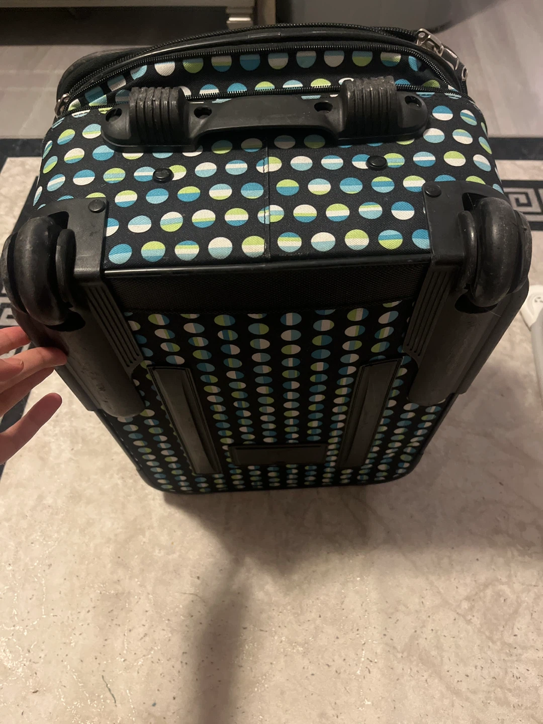 This Skyway rolling suitcase has a fun polka dot pattern. It's a convenient carry-on size, perfect for quick trips. Features multiple zippered compartments for organization.