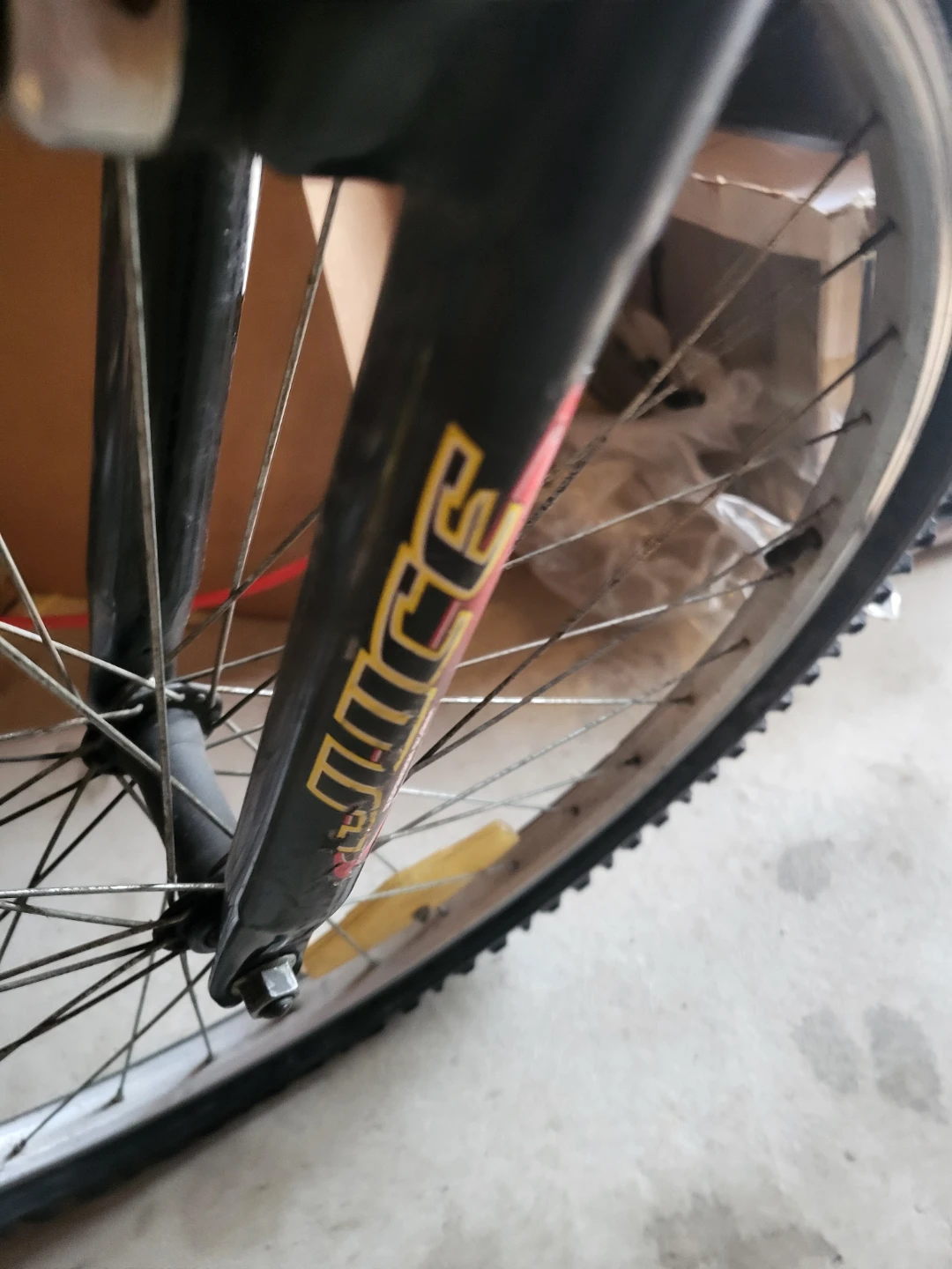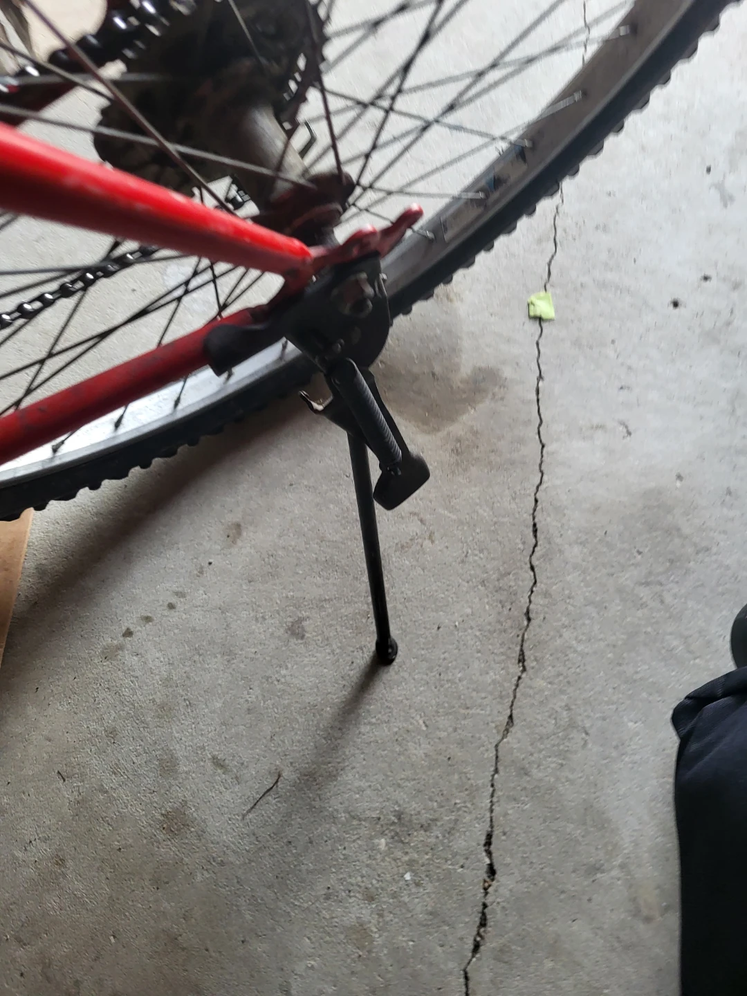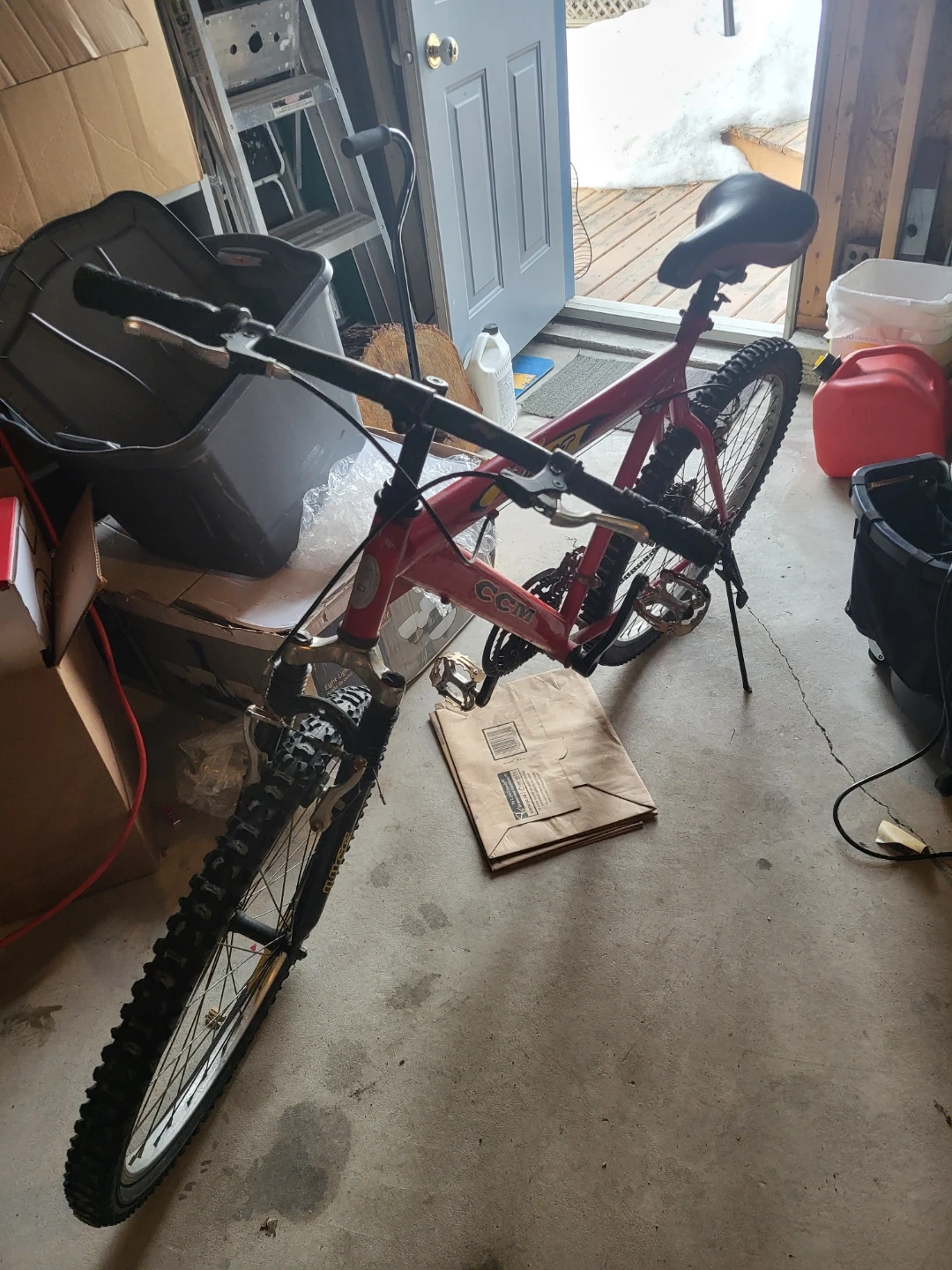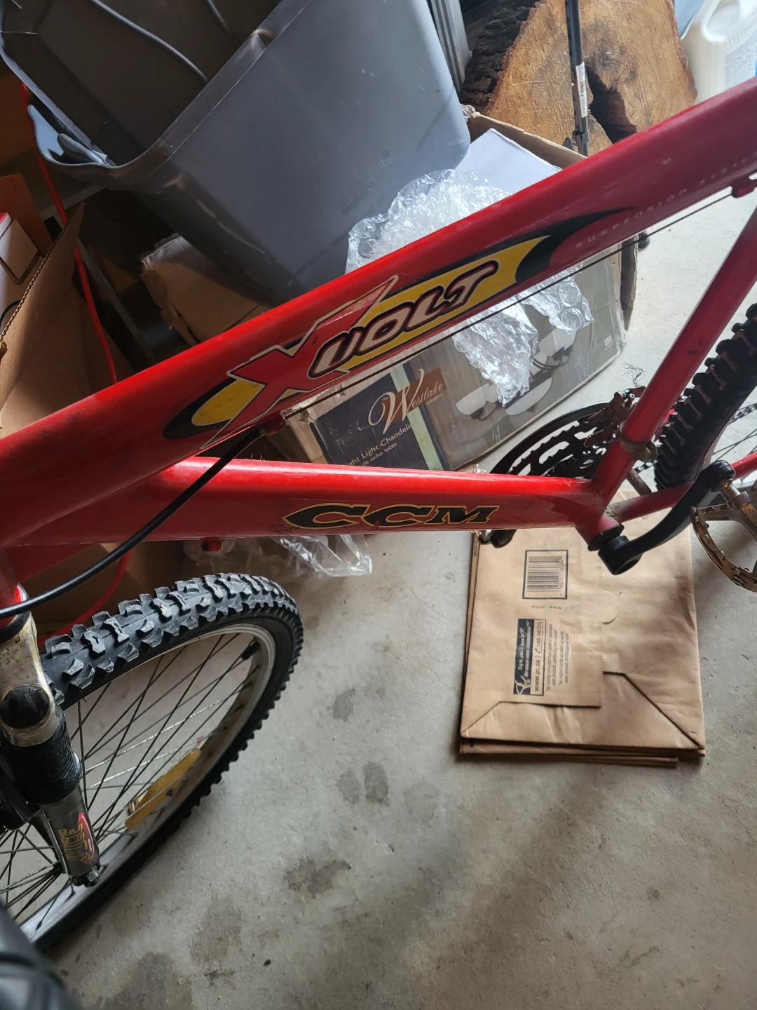 This is a red CCM mountain bike with front suspension. It has knobby tires for off-road use. A kickstand is included for easy parking.