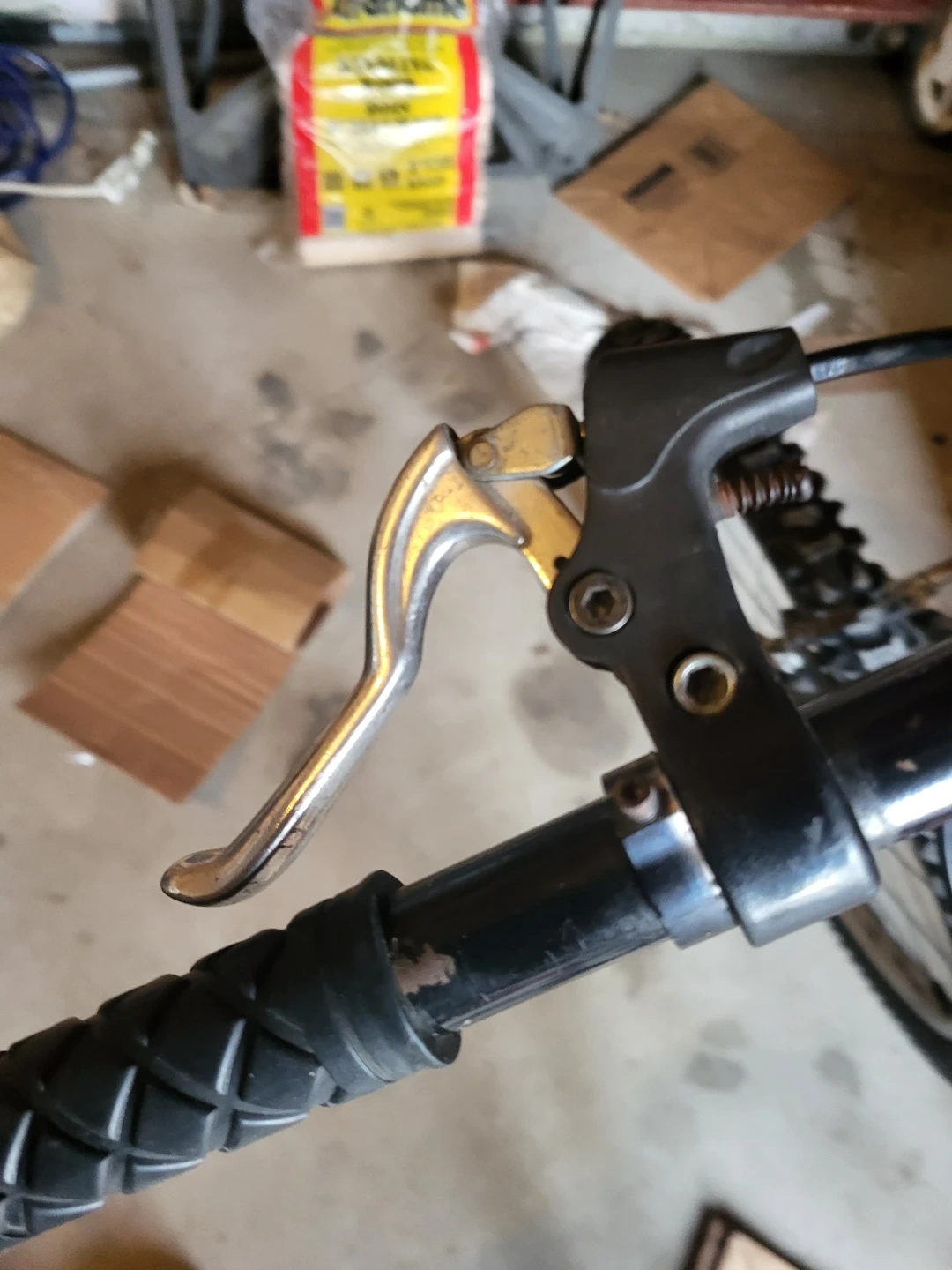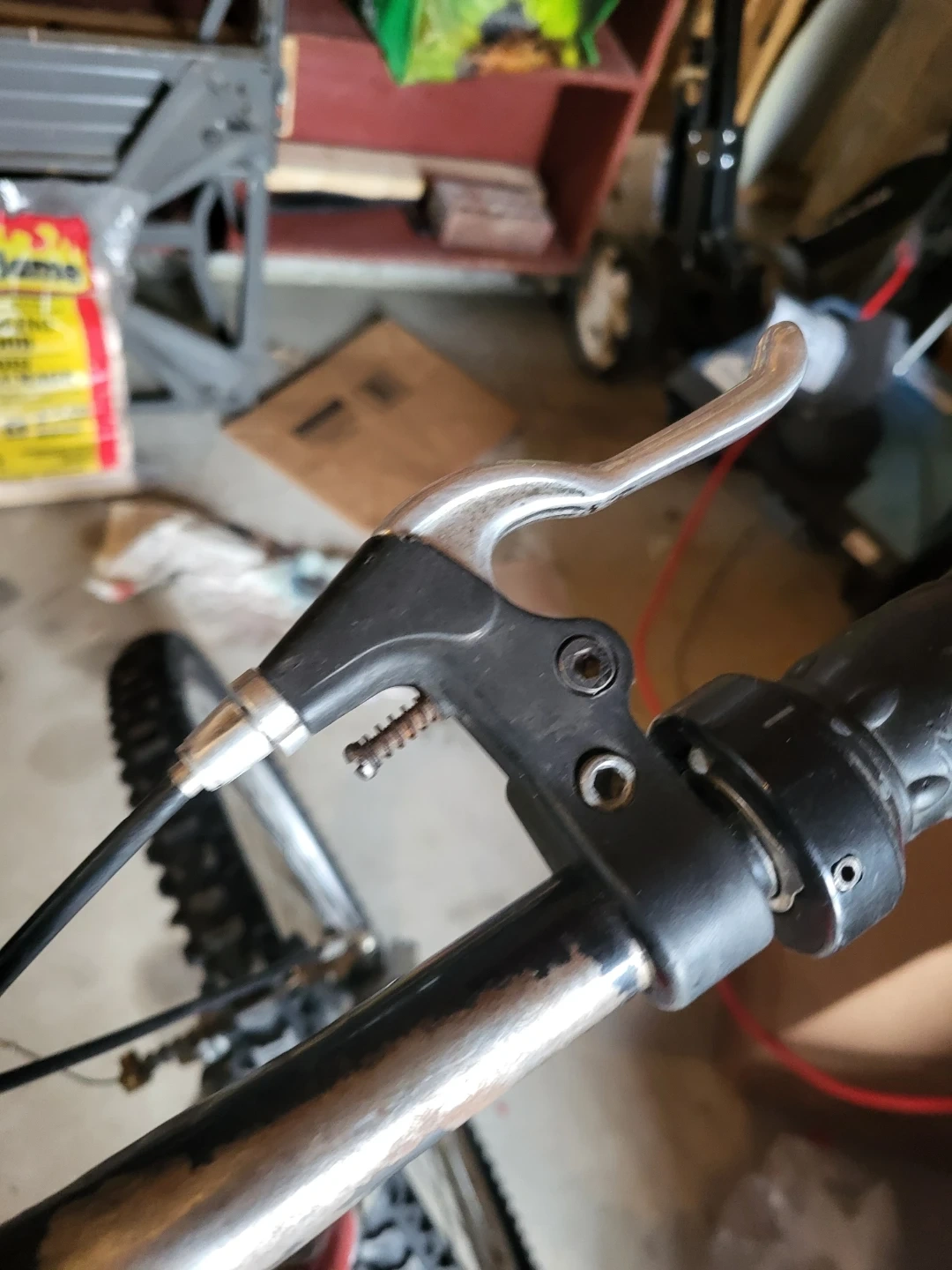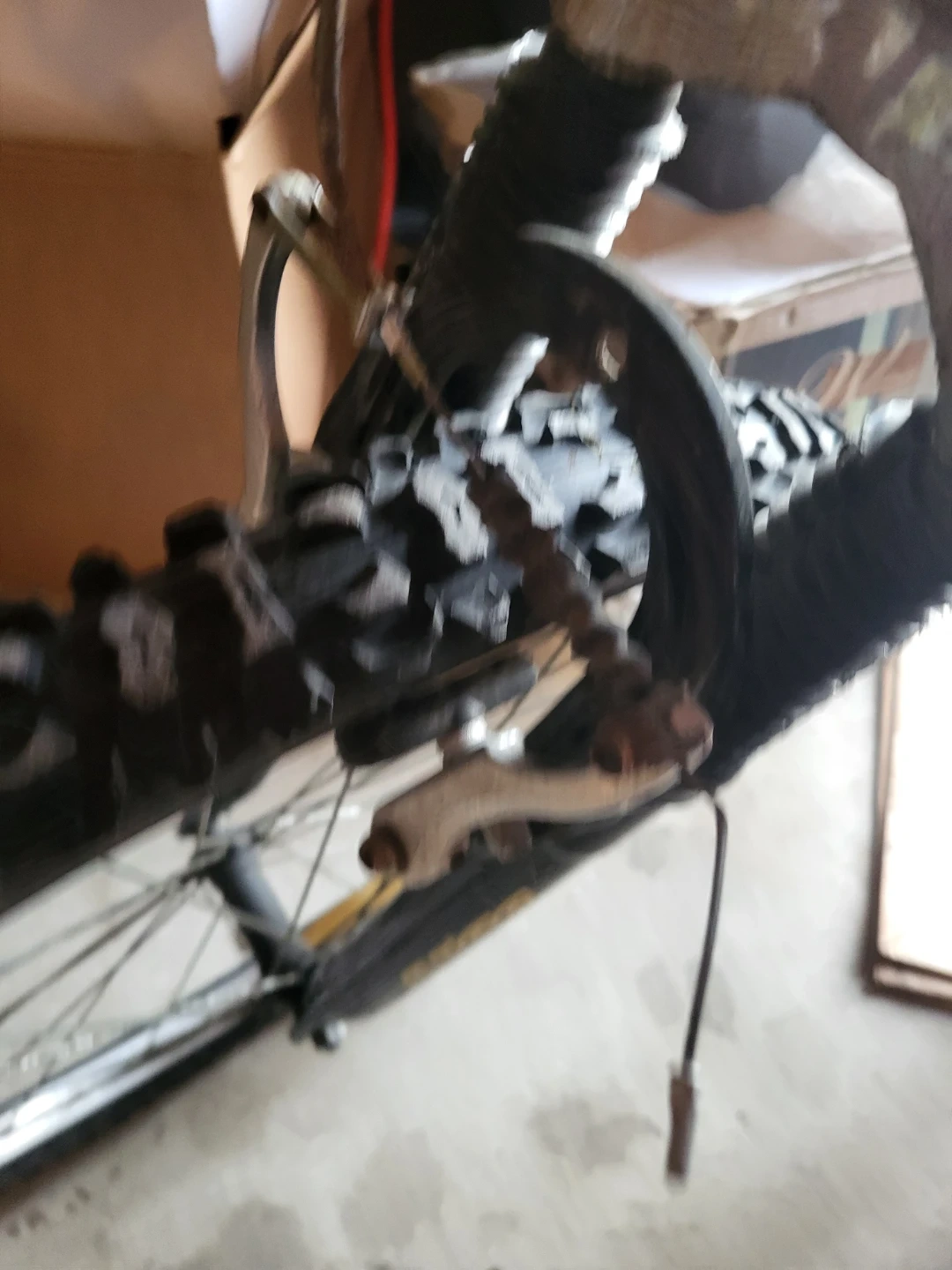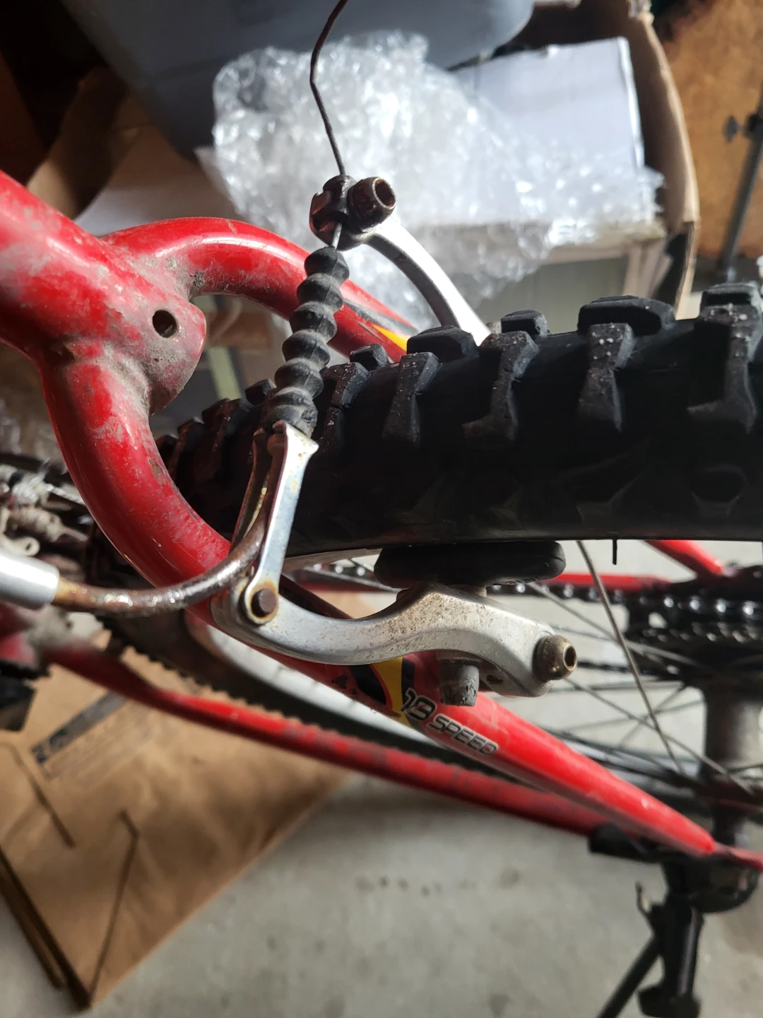 This is a red CCM mountain bike with front suspension. It has knobby tires for off-road use. A kickstand is included for easy parking.