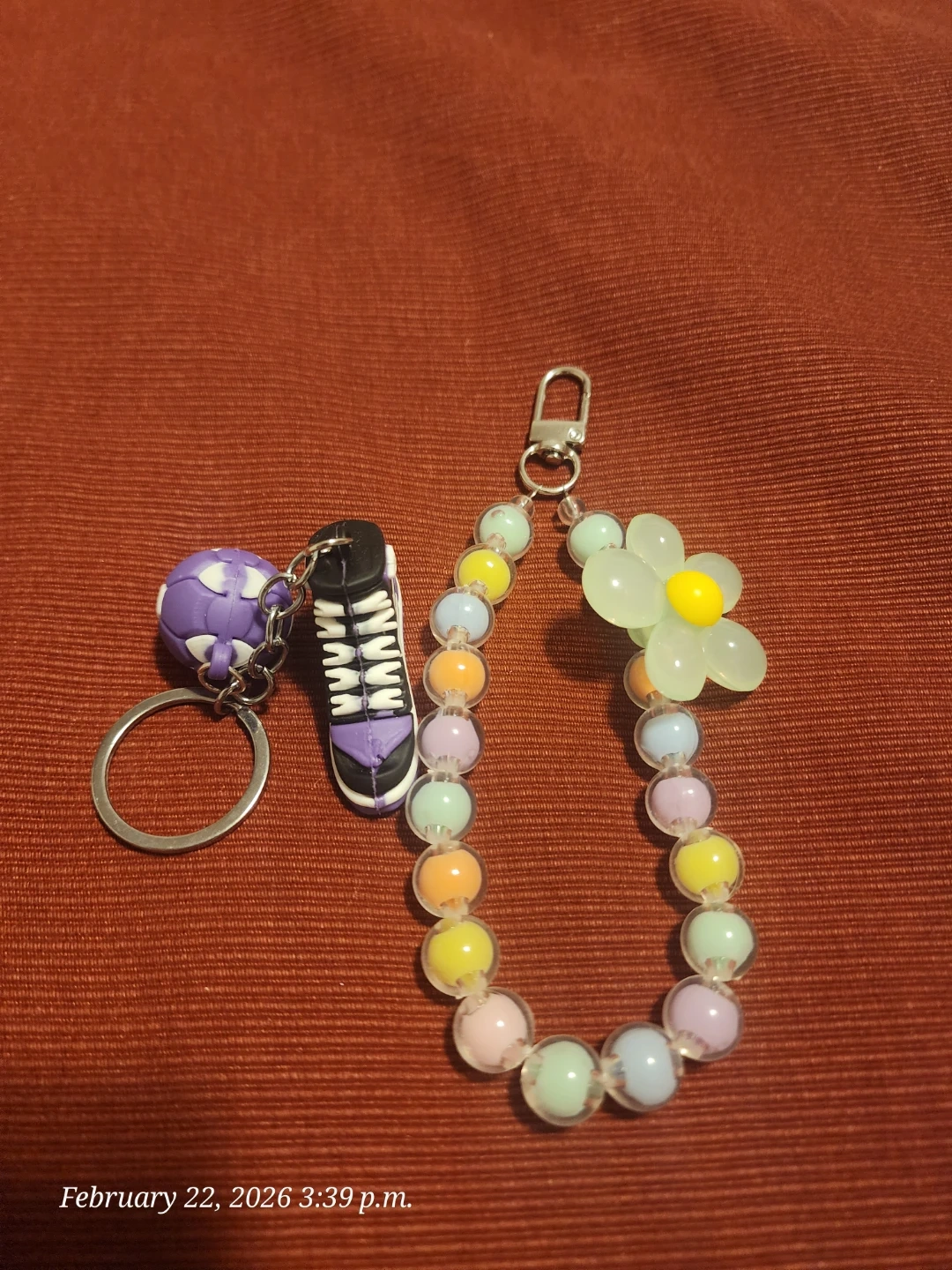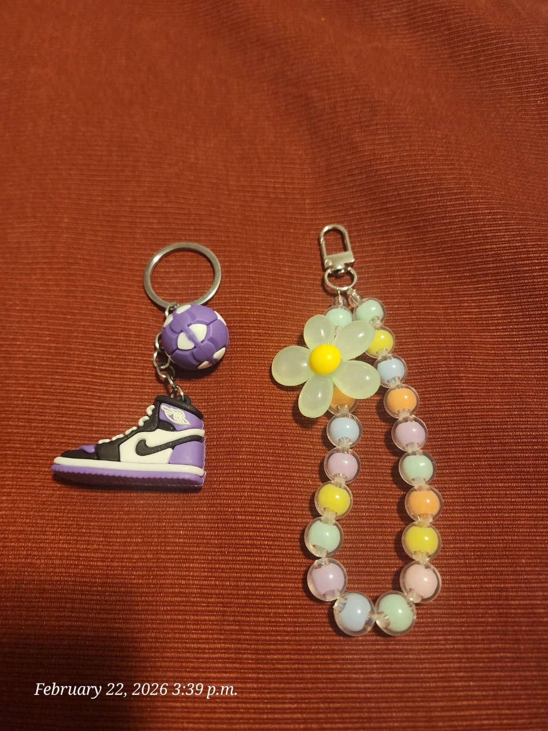 This set includes two unique keychains. One features a colourful beaded chain with a translucent yellow flower charm. The other has a charm resembling a purple and white sneaker, complete with laces and a sole detail. Great for personalizing bags or keys!