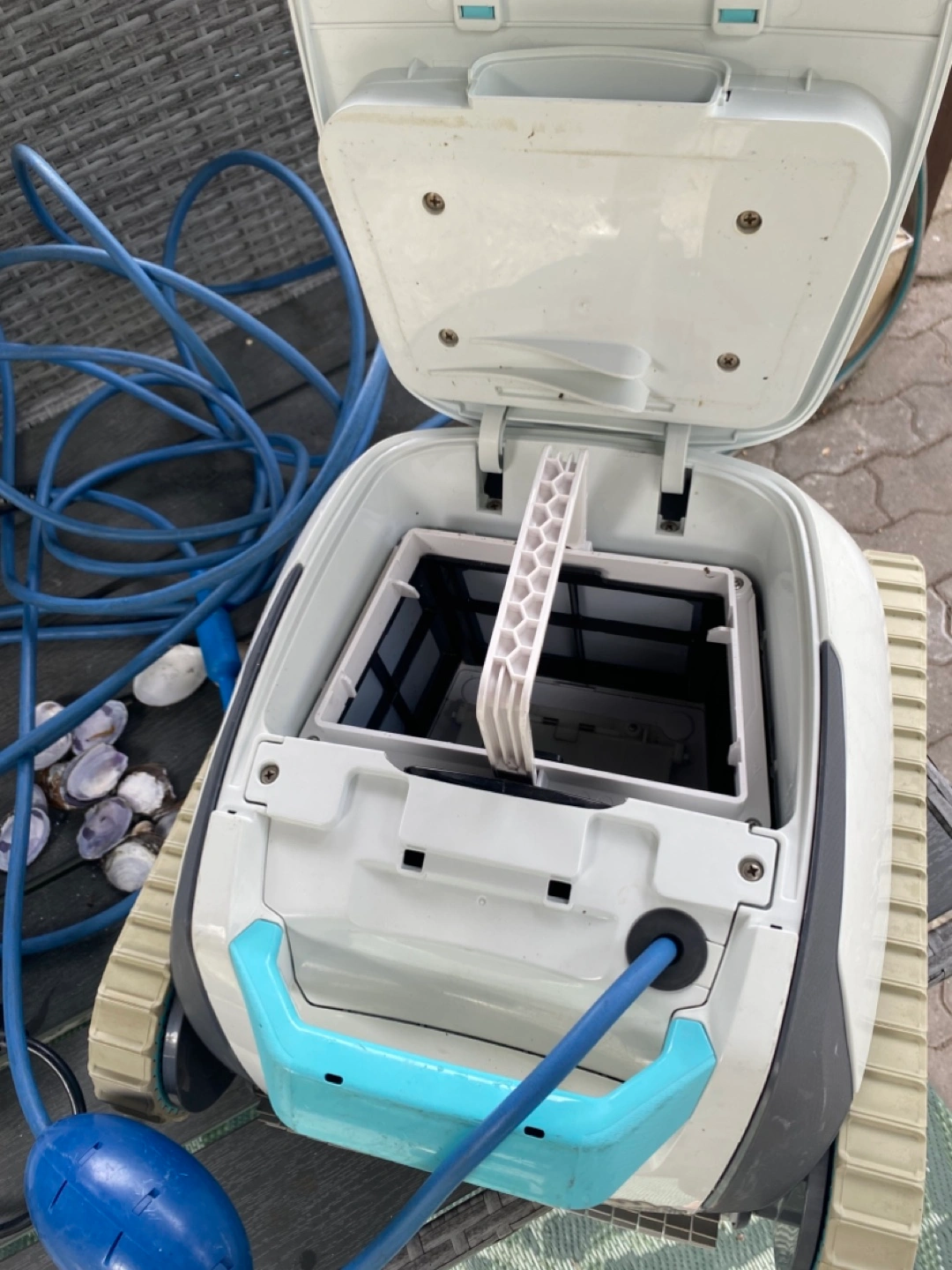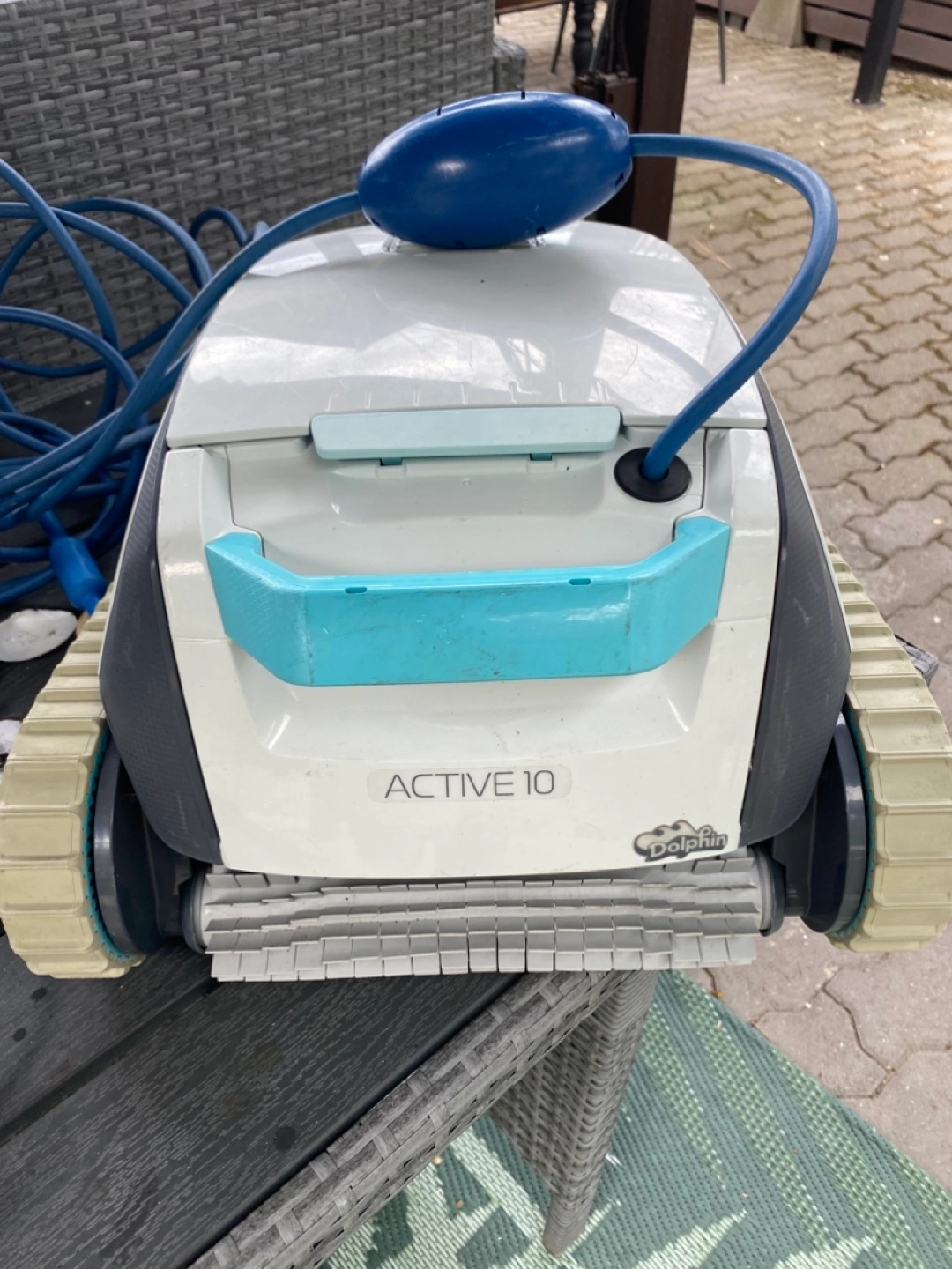 Selling a Dolphin Active 10 robotic pool cleaner. It's in good condition and ready to keep your pool sparkling clean! It features a blue handle and a filter basket.