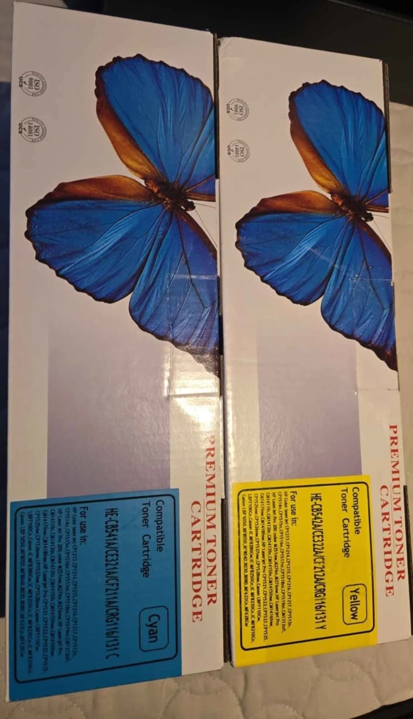 Two compatible toner cartridges, one cyan and one yellow. Model numbers HE-CB541A and HE-CB542A are compatible with several HP LaserJet and Canon LBP models. They are new and sealed in their original packaging.