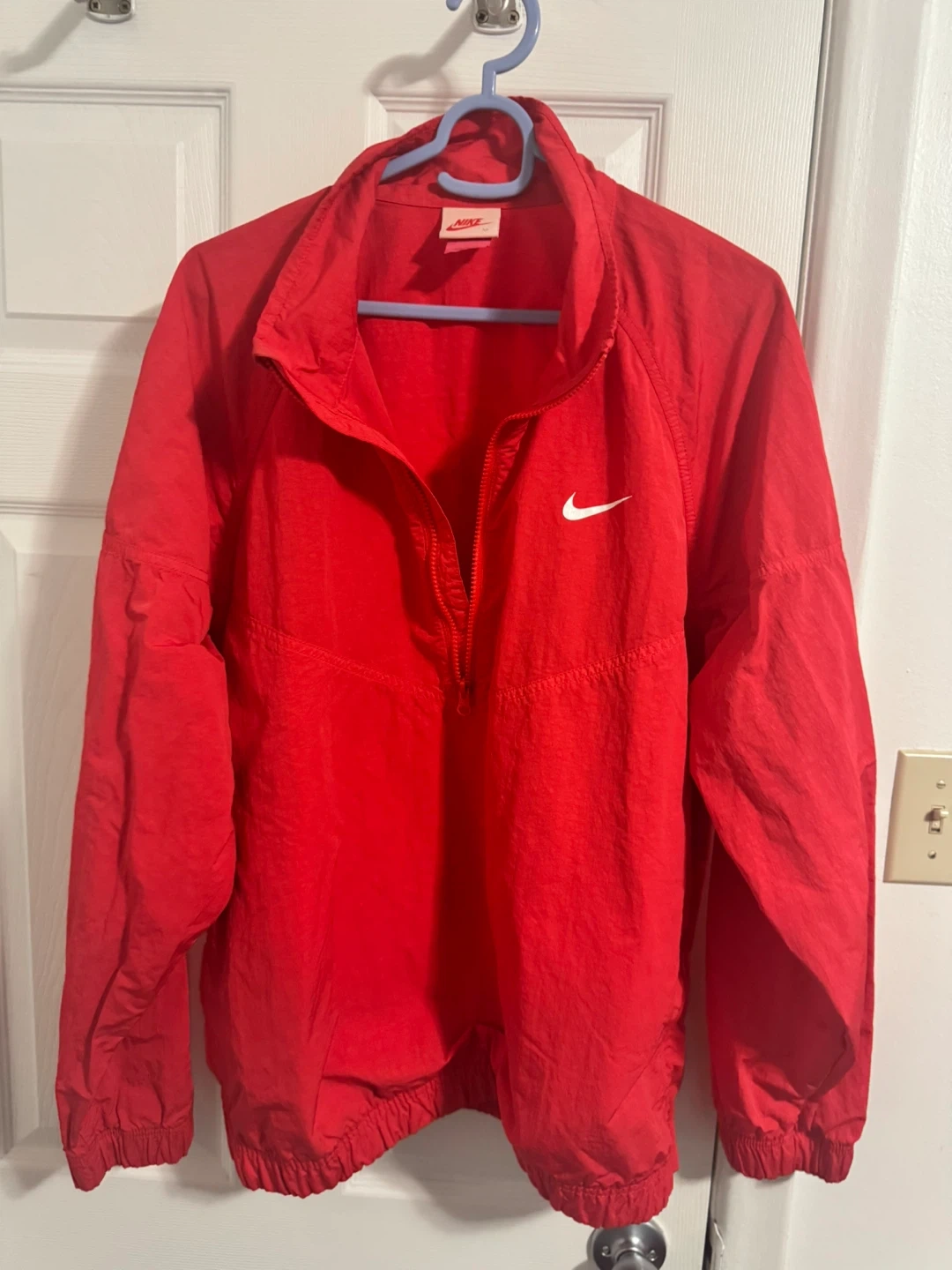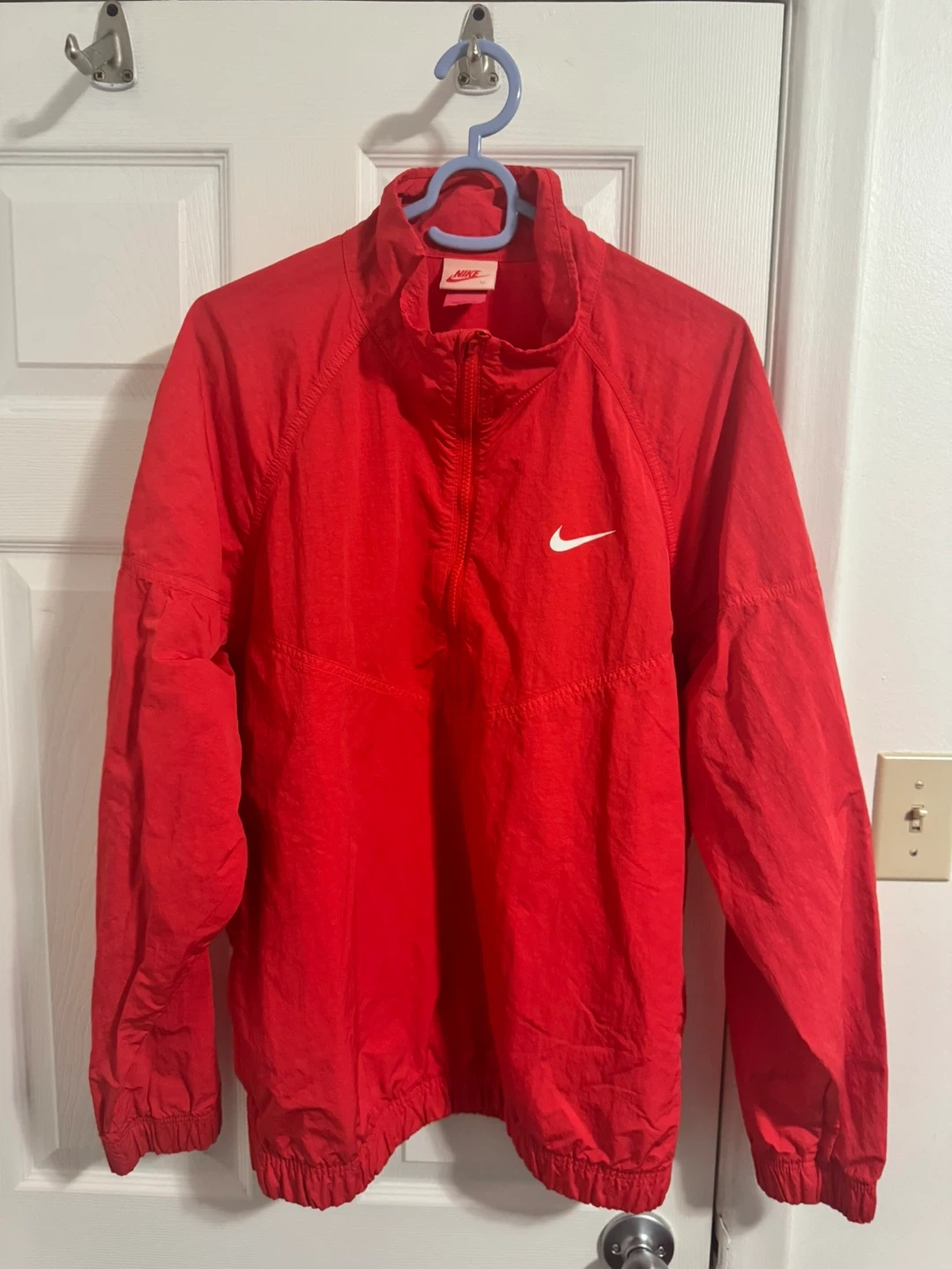Selling a cool Nike x Stussy windbreaker! It's in a vibrant red colour and size M. Perfect for layering or wearing on breezy days. Features the iconic Nike swoosh on the front and the Stussy logo on the back!