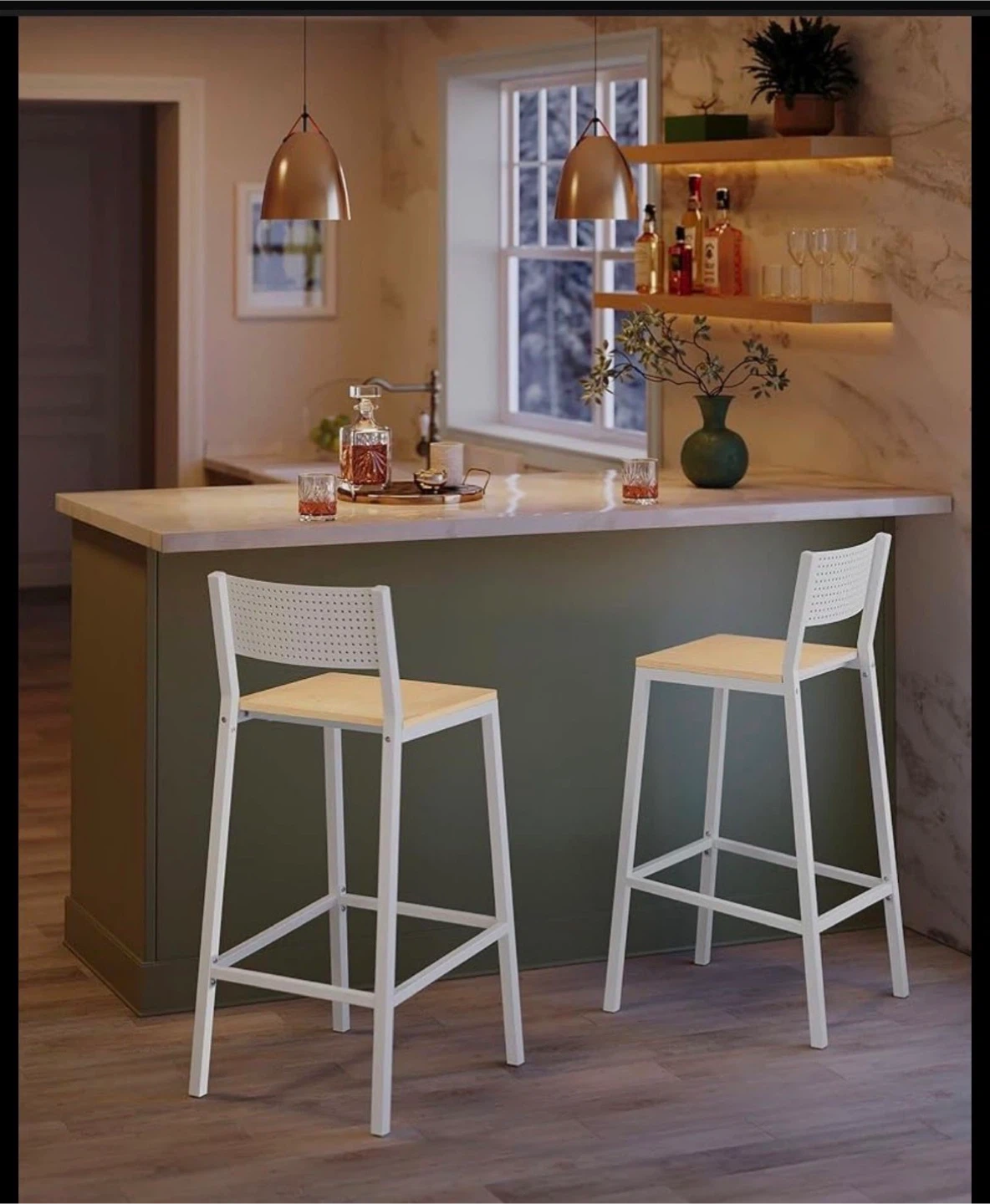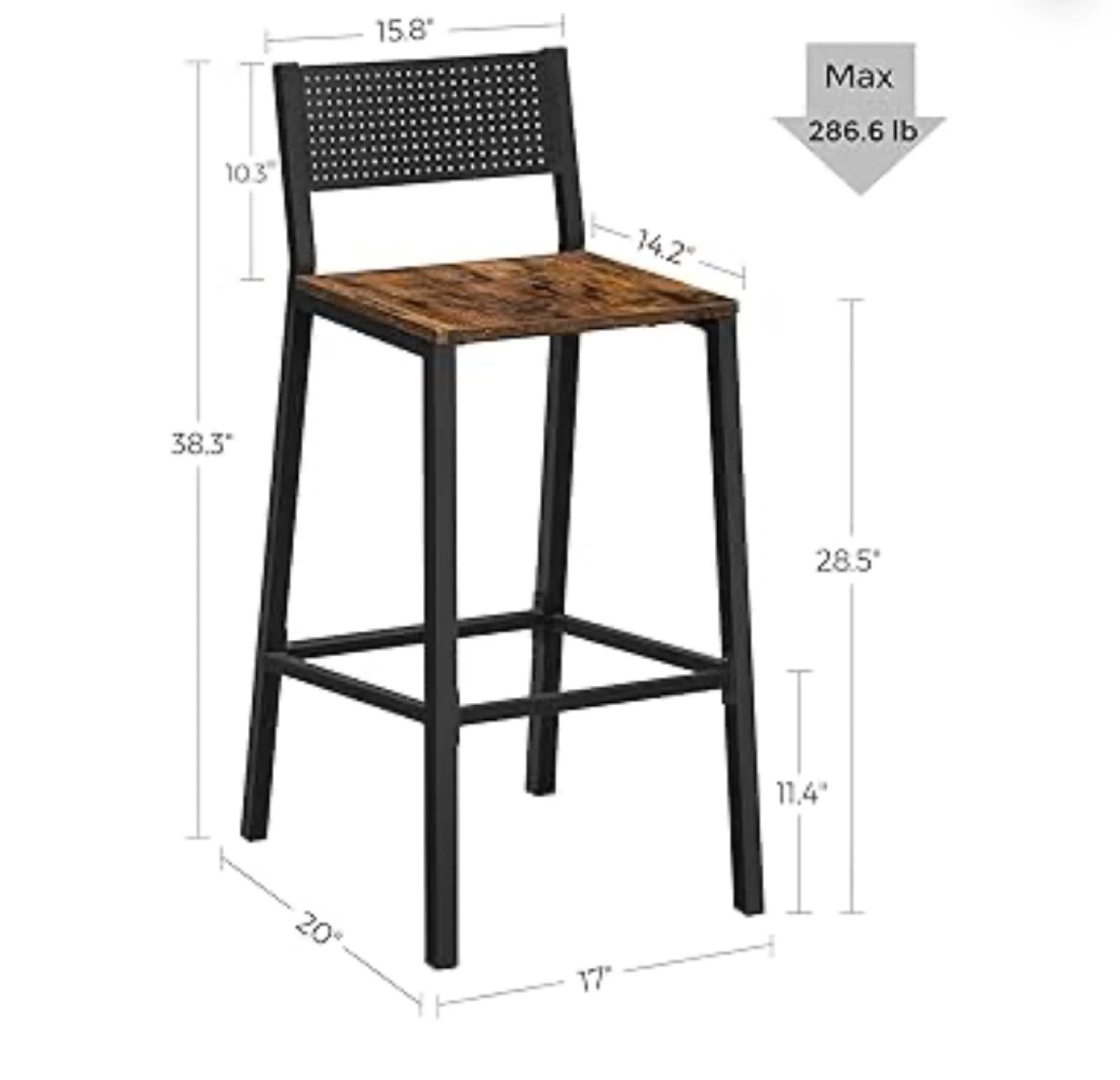 Selling a set of two bar stools with white metal frames and wood-look seats. Seat height is 28.5 inches. Max weight capacity is 286.6 lbs per stool. These stools would be useful for a kitchen island or bar area. They're sturdy and have a modern design.
