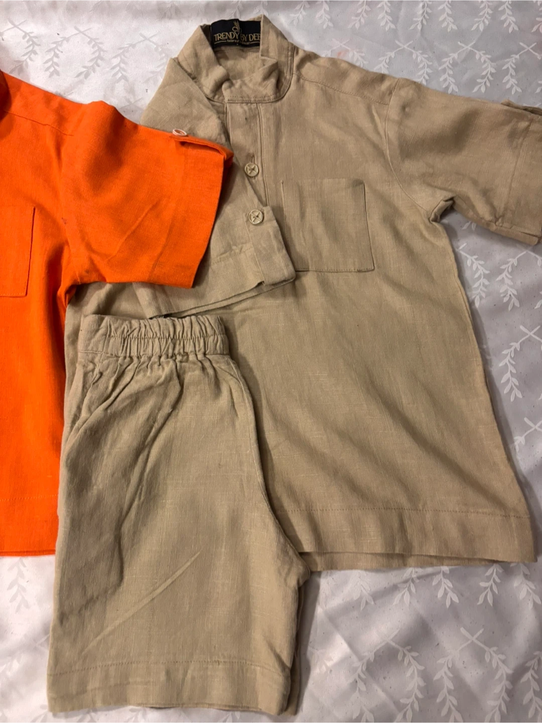 A cute little outfit from Trendy by Deb Includes a short-sleeved shirt and shorts in beige and orange. Perfect for keeping your little one comfy and stylish.