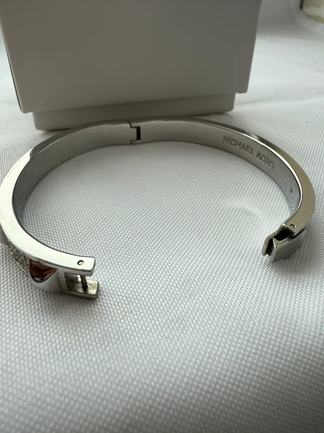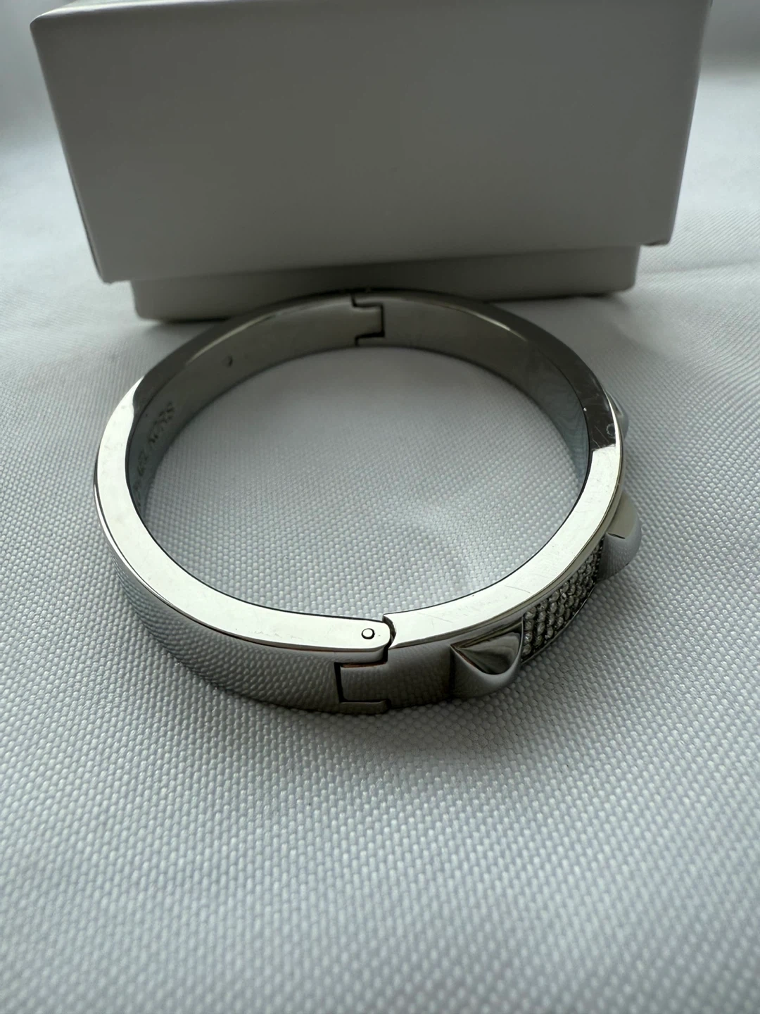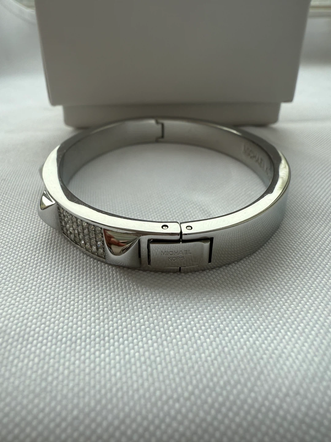 Silver-tone Michael Kors bangle bracelet. It's adorned with pyramid studs and clear crystals. Includes original box. Perfect for adding a touch of glam to any outfit!
