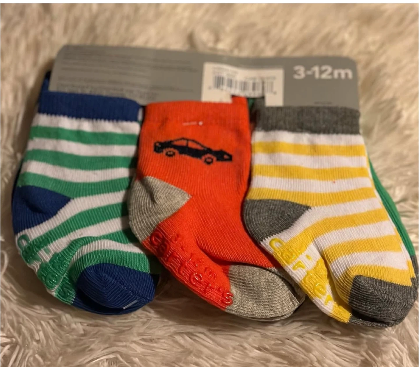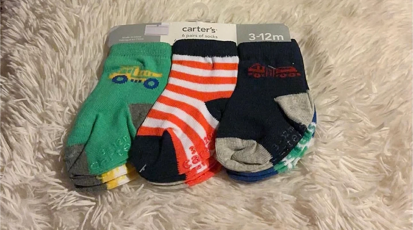 Here's a set of Carter's baby socks, perfect for little ones aged 3-12 months! Each pair features a cute design and grippers on the soles to help prevent slips. They're in great condition and ready for a new home