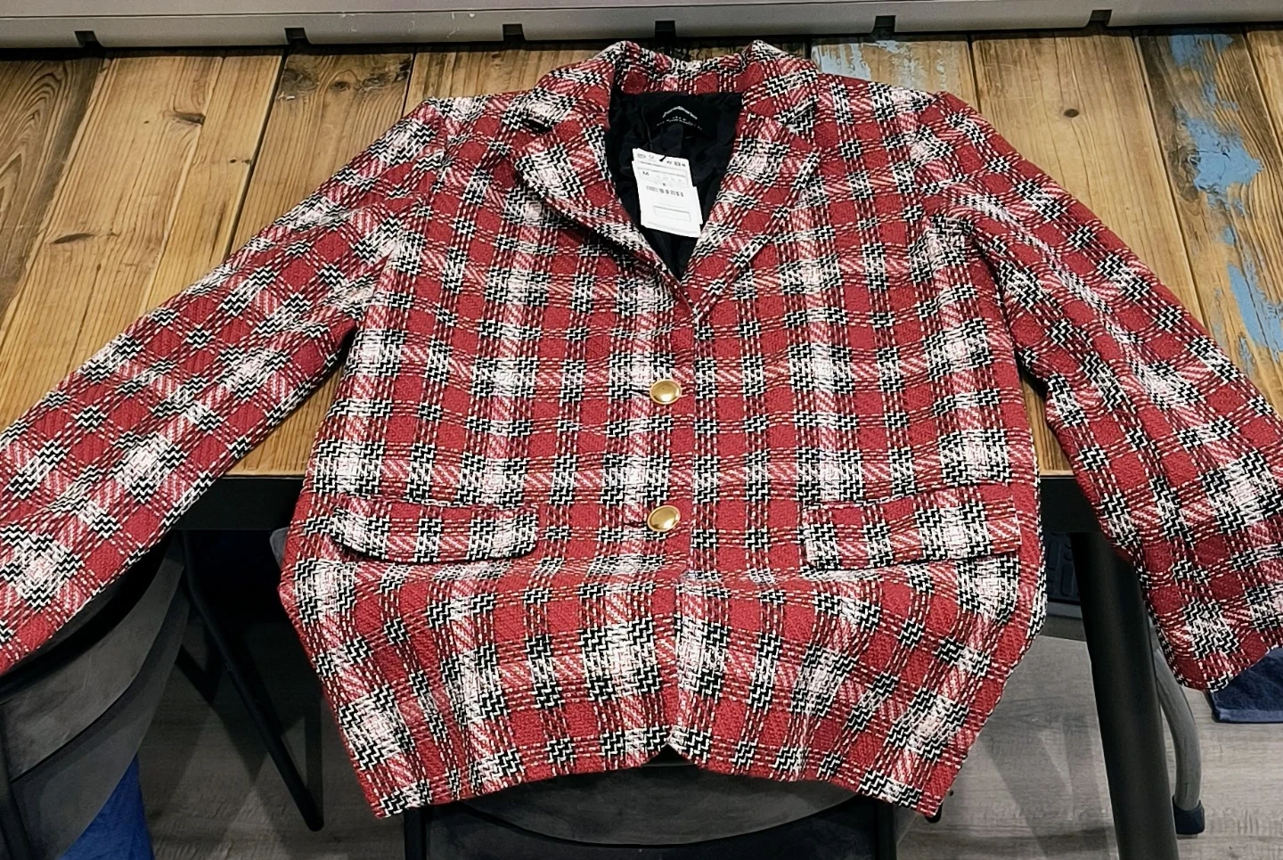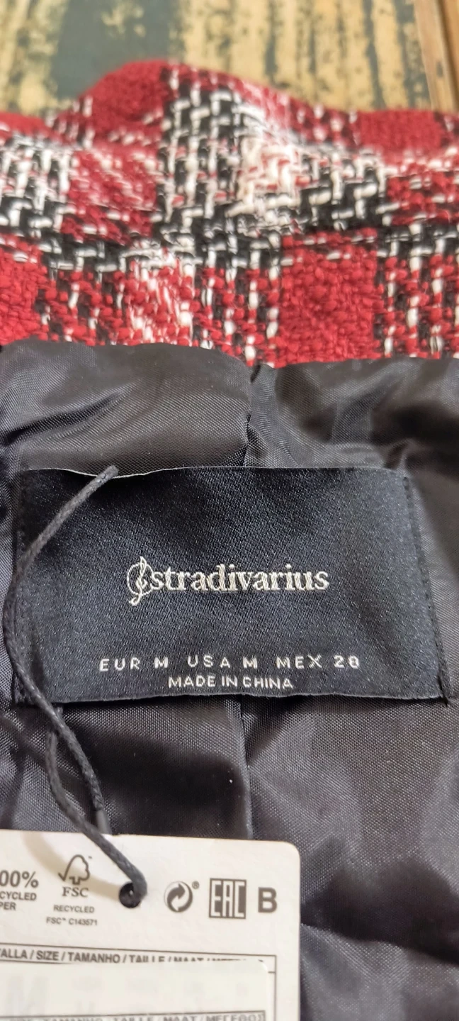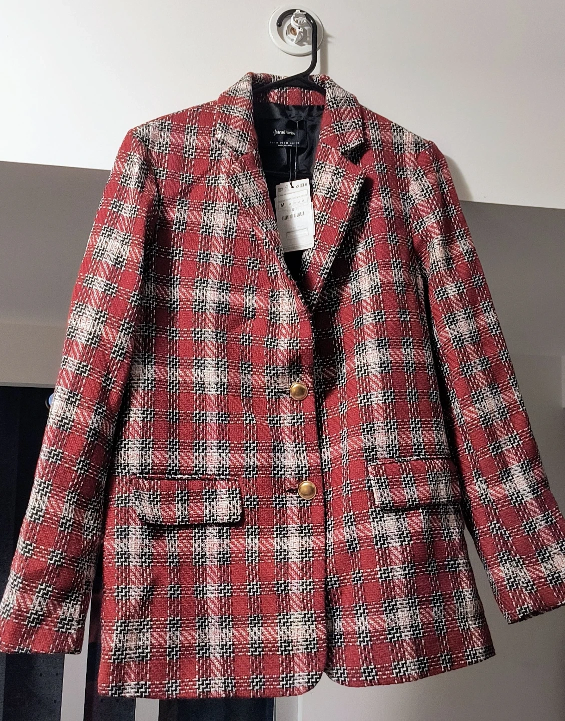 This is a Stradivarius women's blazer. It features a red, white, and black plaid pattern. The blazer is a size medium and has two gold-toned buttons at the front. It's perfect for layering over tops for a stylish look.