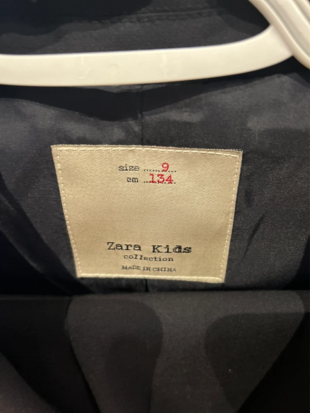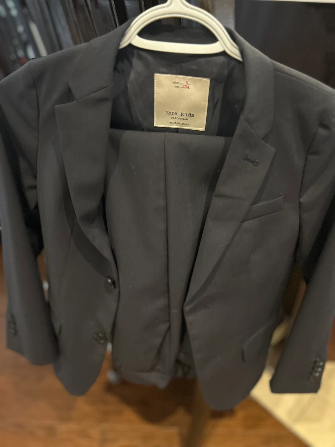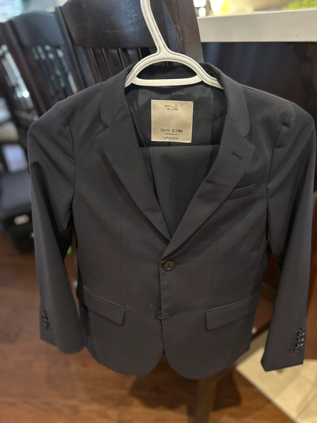 This is a Zara Kids suit set. It's a size 9, which corresponds to 134 cm. This two-piece outfit is perfect for special occasions or formal events.