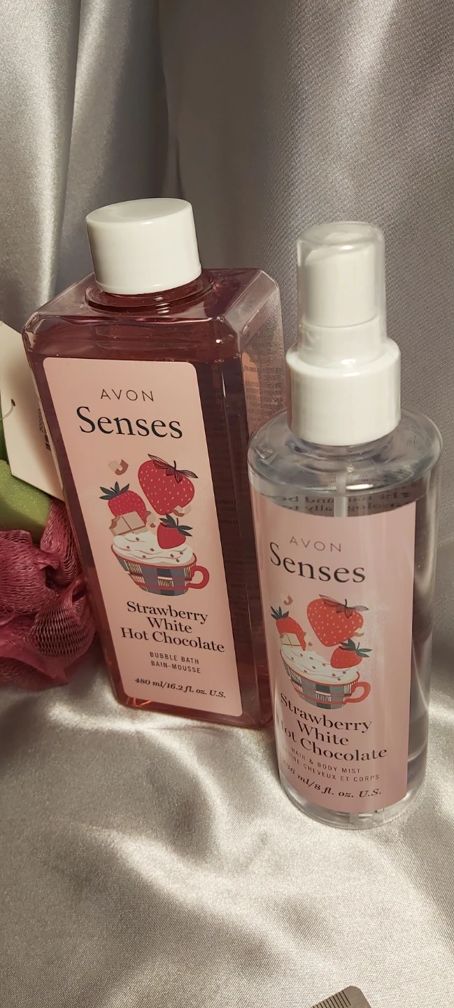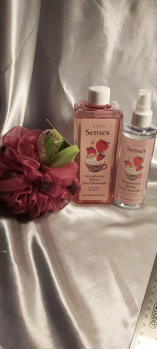 New, strawberry and white hot chocolate bubble bath and matching body spray with bath scrubber. Pick up Walkerville area