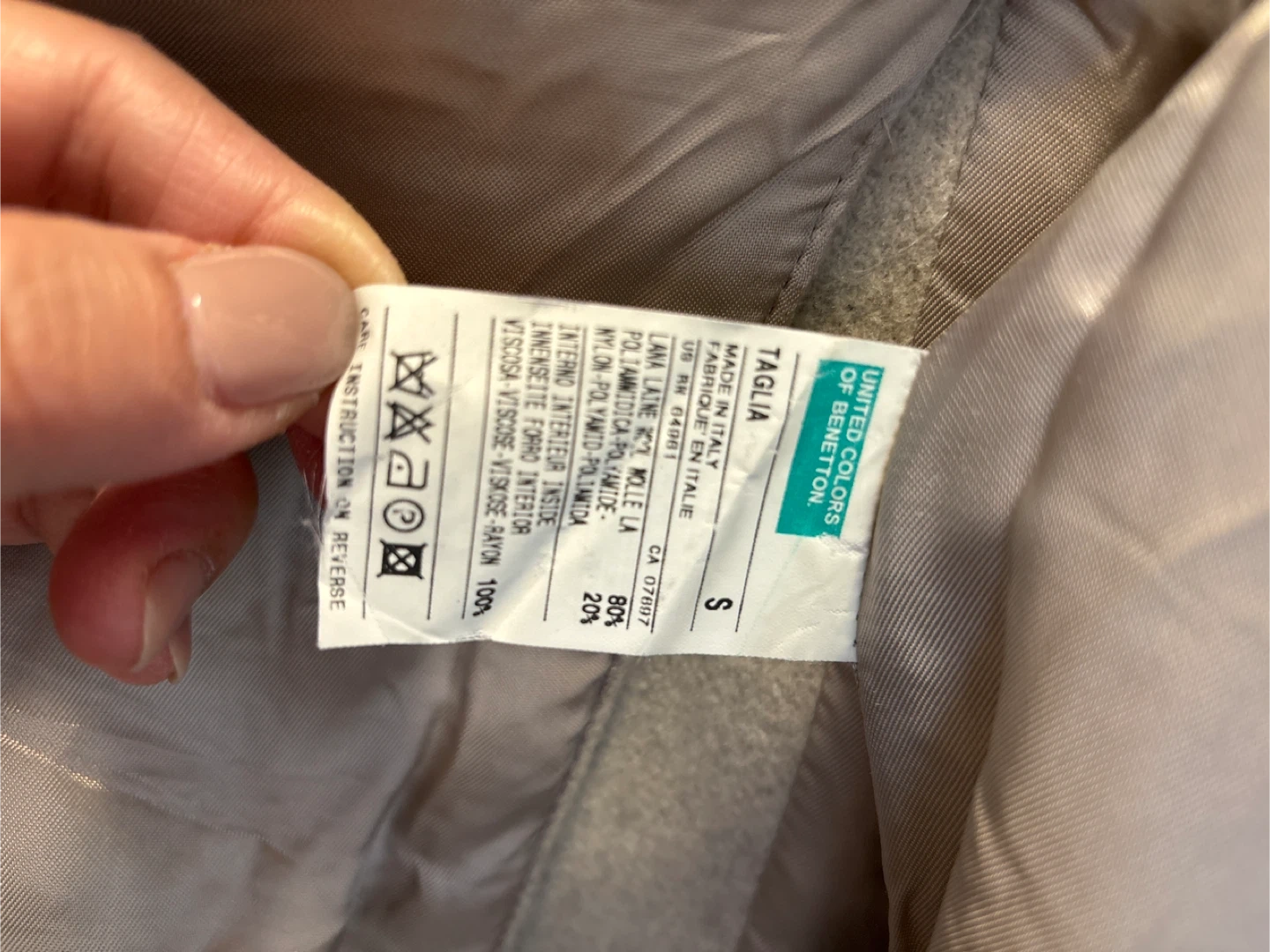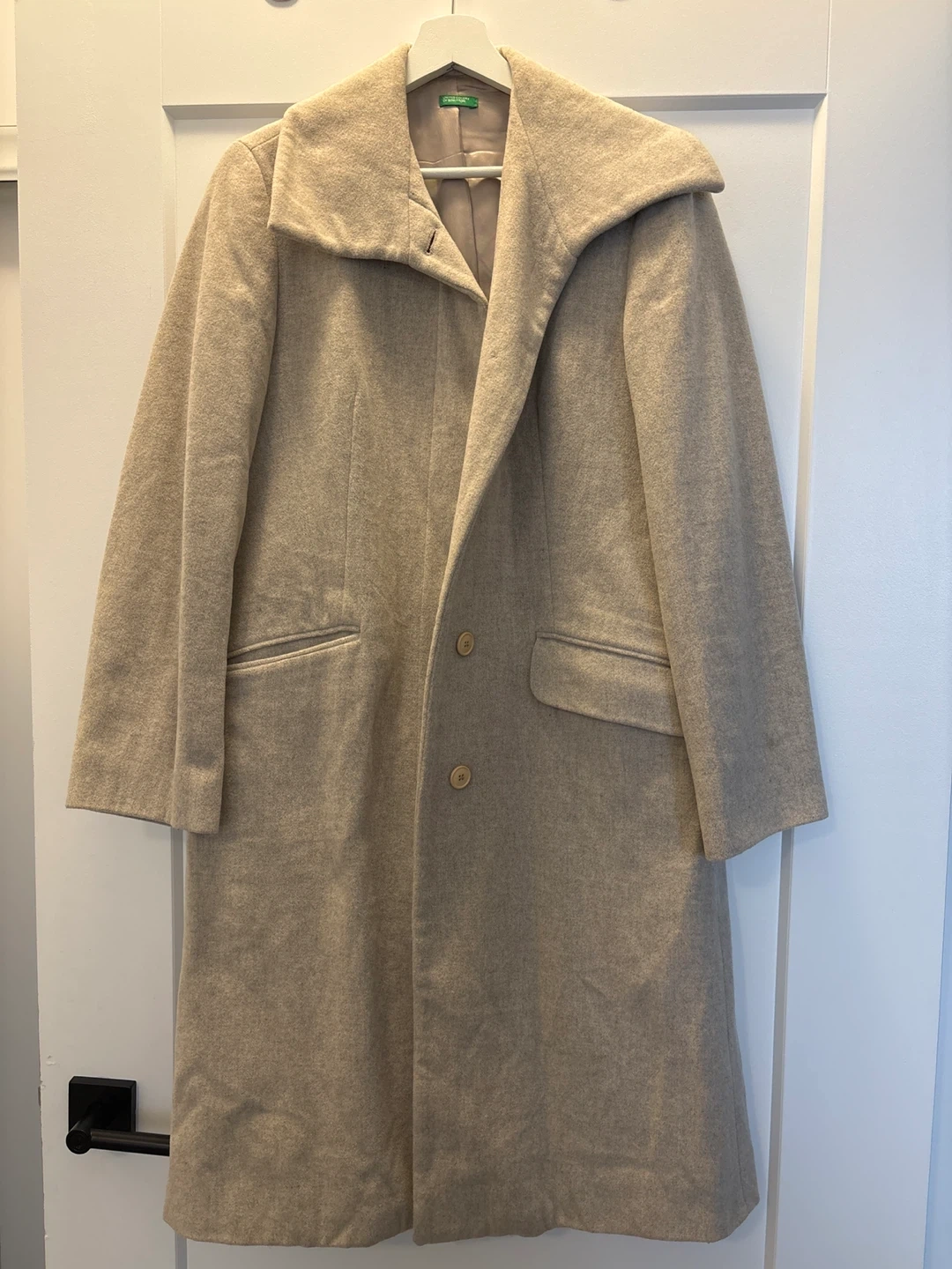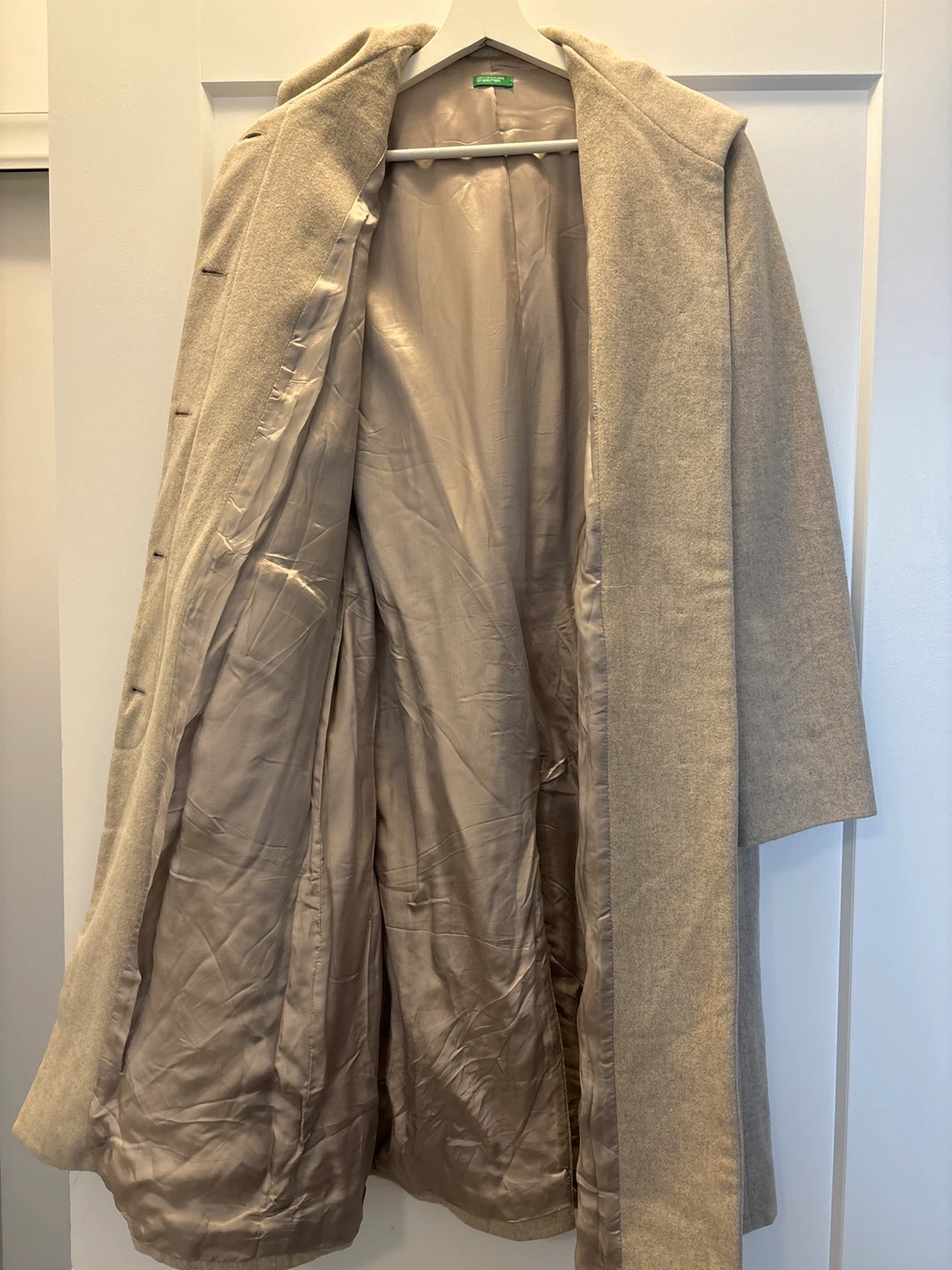 A stylish beige wool blend coat from United Colors of Benetton. Made in Italy, this coat is size S. It's lined with a silky material for a smooth feeling