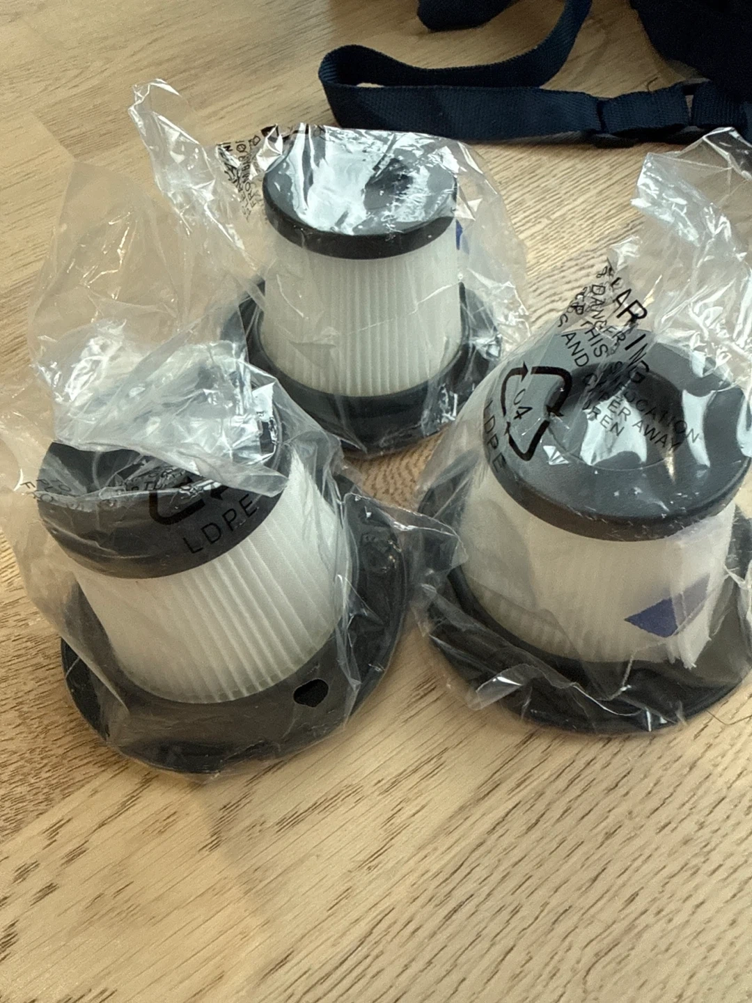 Vacuum cleaner + pack of three replacement filters. These are designed to capture fine dust particles.