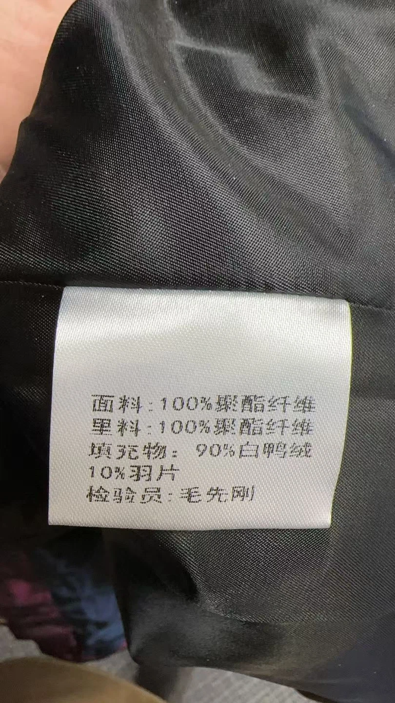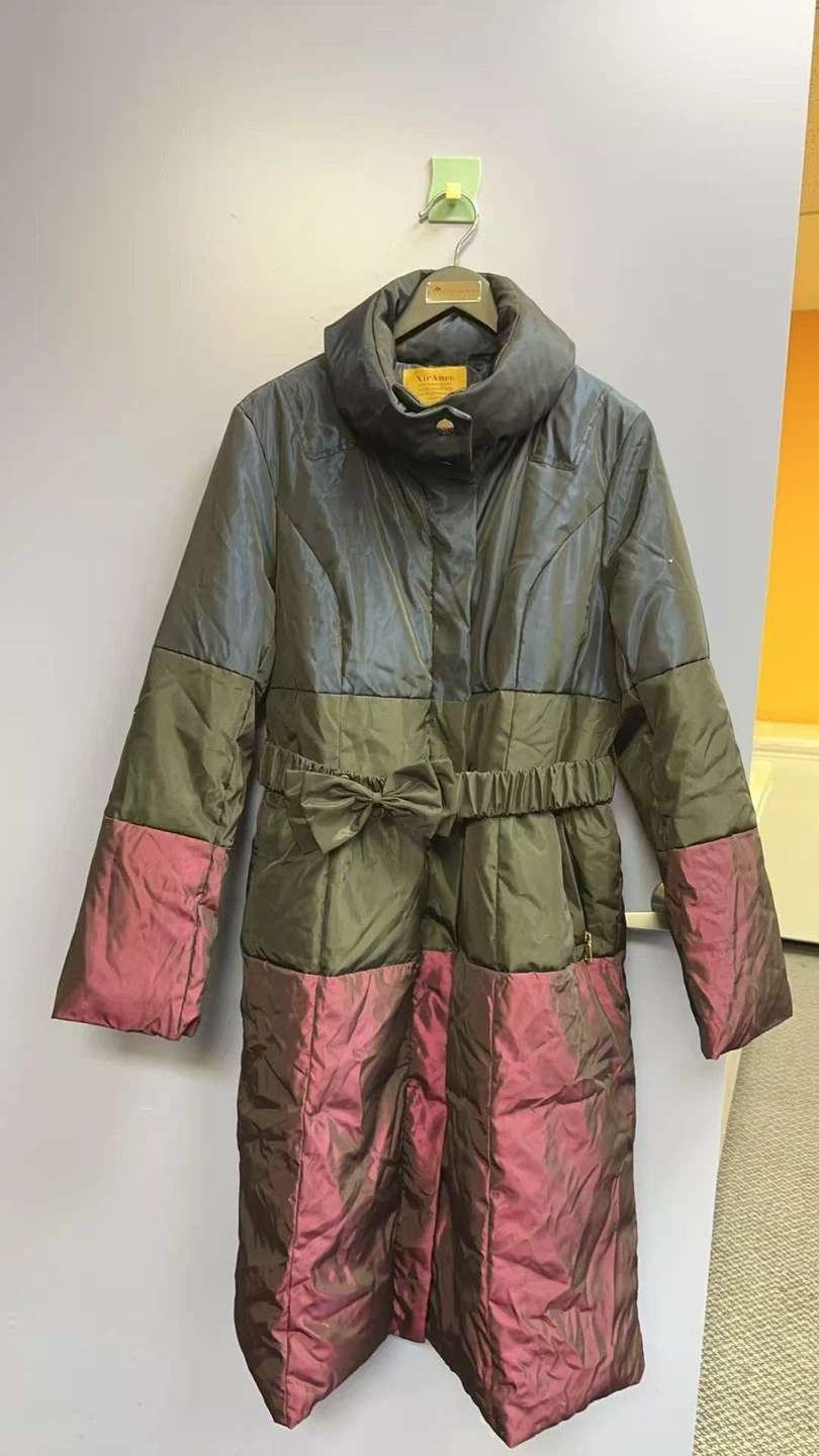 This long puffer coat features a striking colour block design in shades of navy, olive green, and deep rose. It has a cinched waist with a fabric bow belt and a high collar. The outer shell is 100% polyester, and the filling is 90% white duck down and 10% feather. It's perfect for staying warm on chilly days!