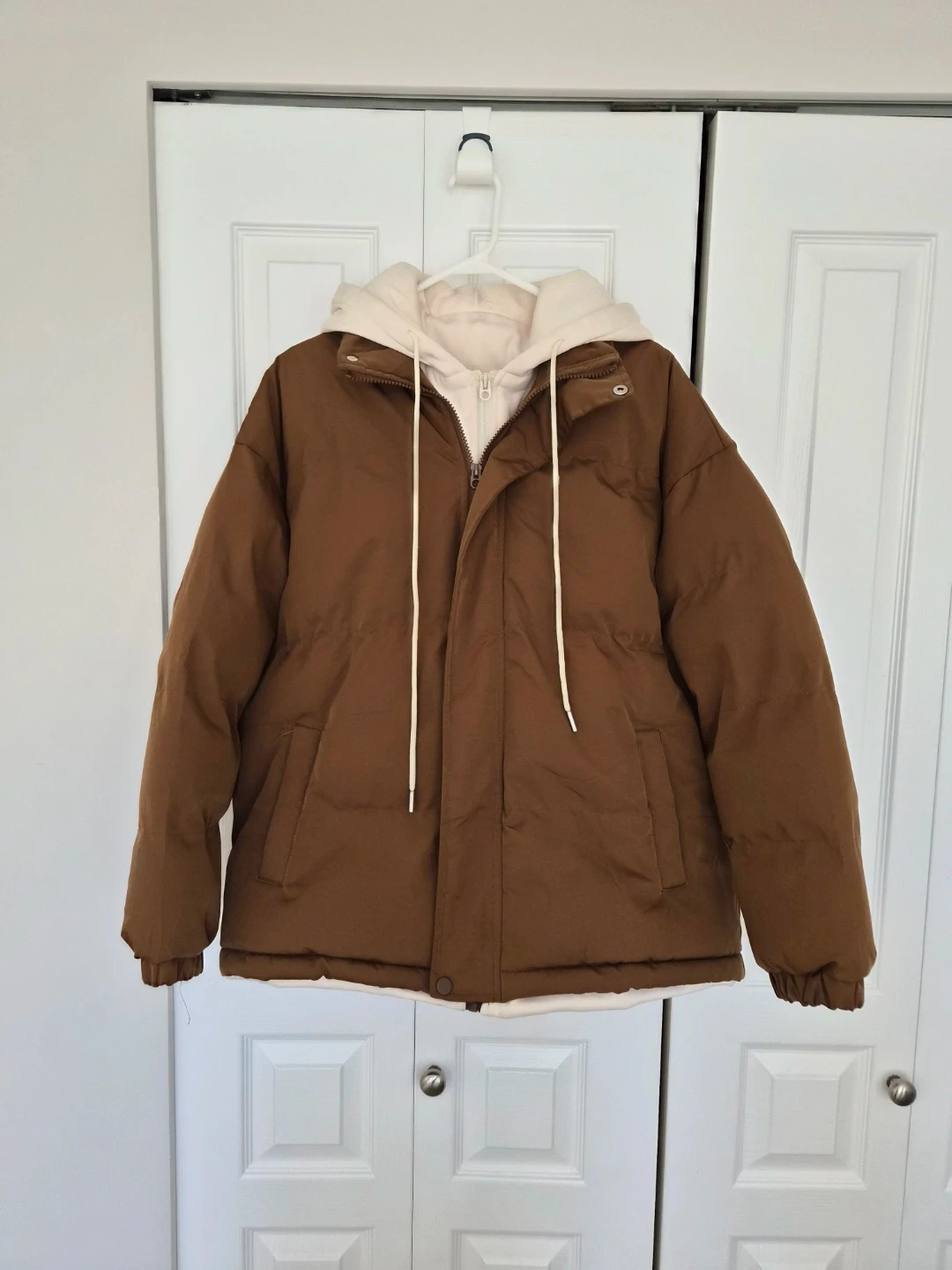 Brown Puffer Jacket with Cream Hood
