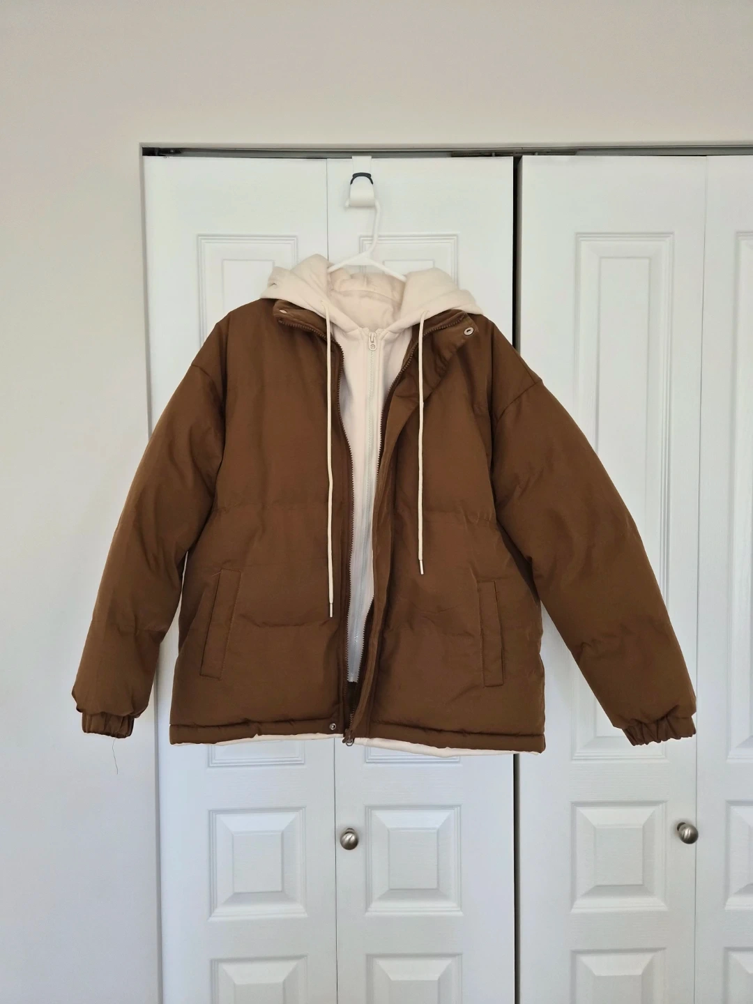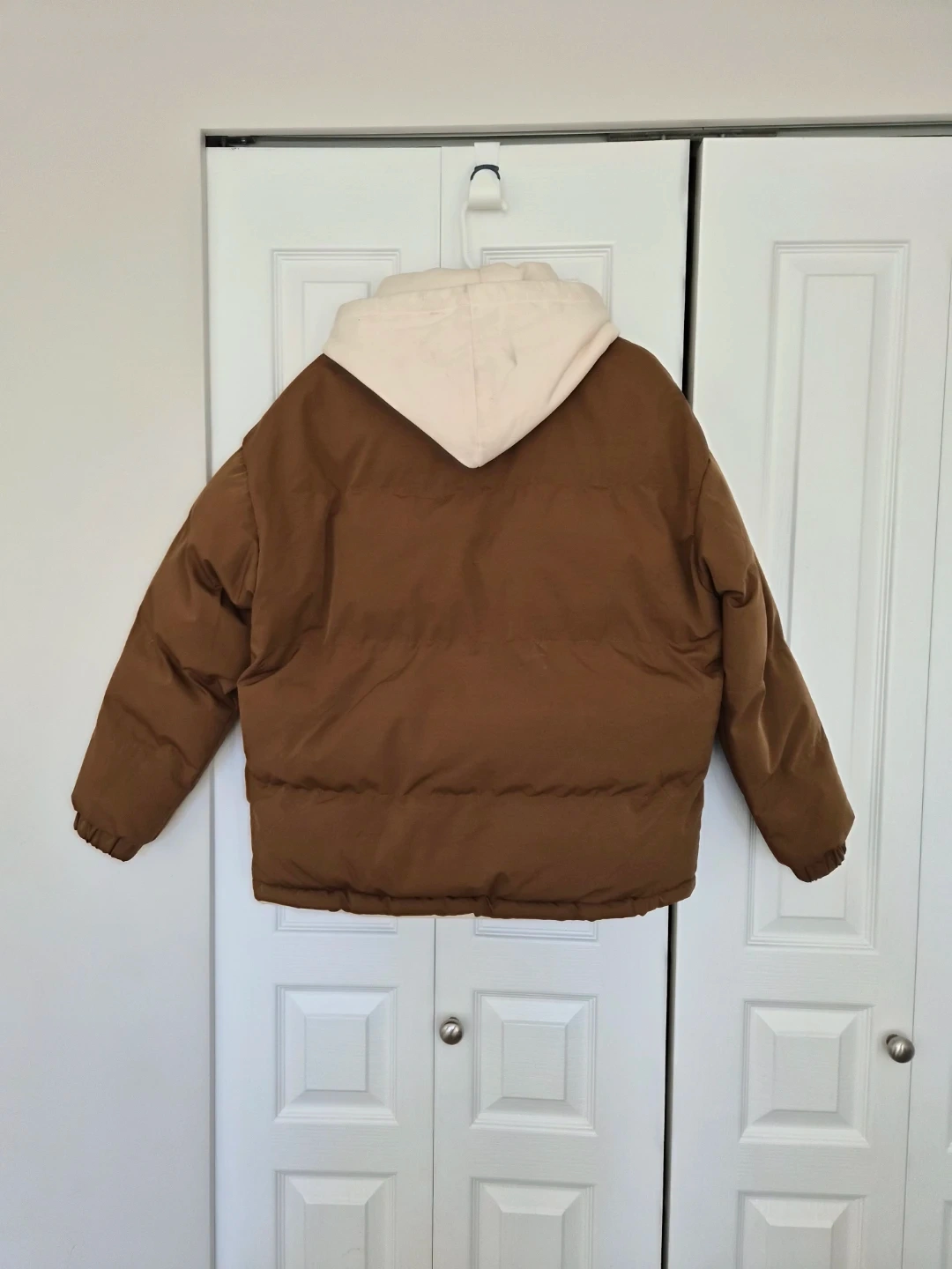 Brown Puffer Jacket with Cream Hood
