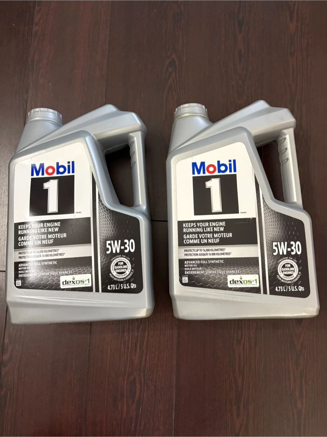 1 bottles of Mobil 1 5W-30 synthetic engine oil. Full synthetic advanced protection. Each bottle is 4.73 L / 5 U.S. Qts. Protects up to 16,000 kilometres.