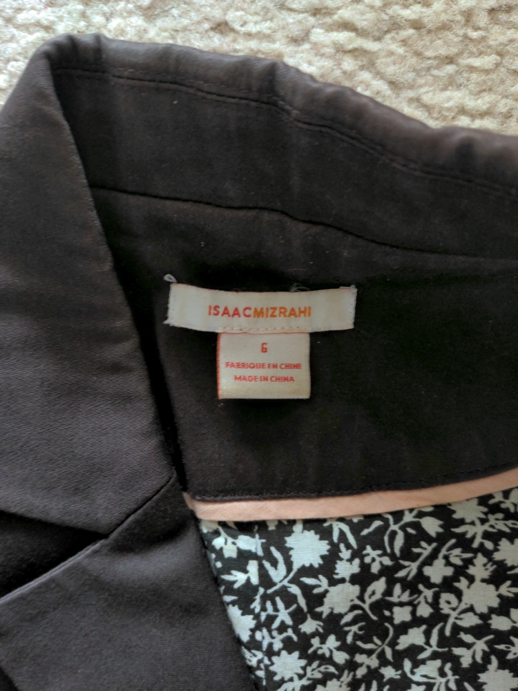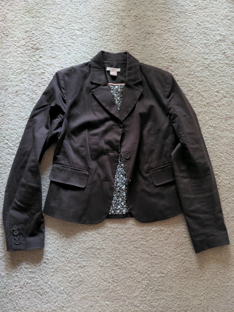 Brown blazer, size 6. Classic style, long sleeves. Made in China. Features a subtle floral lining.