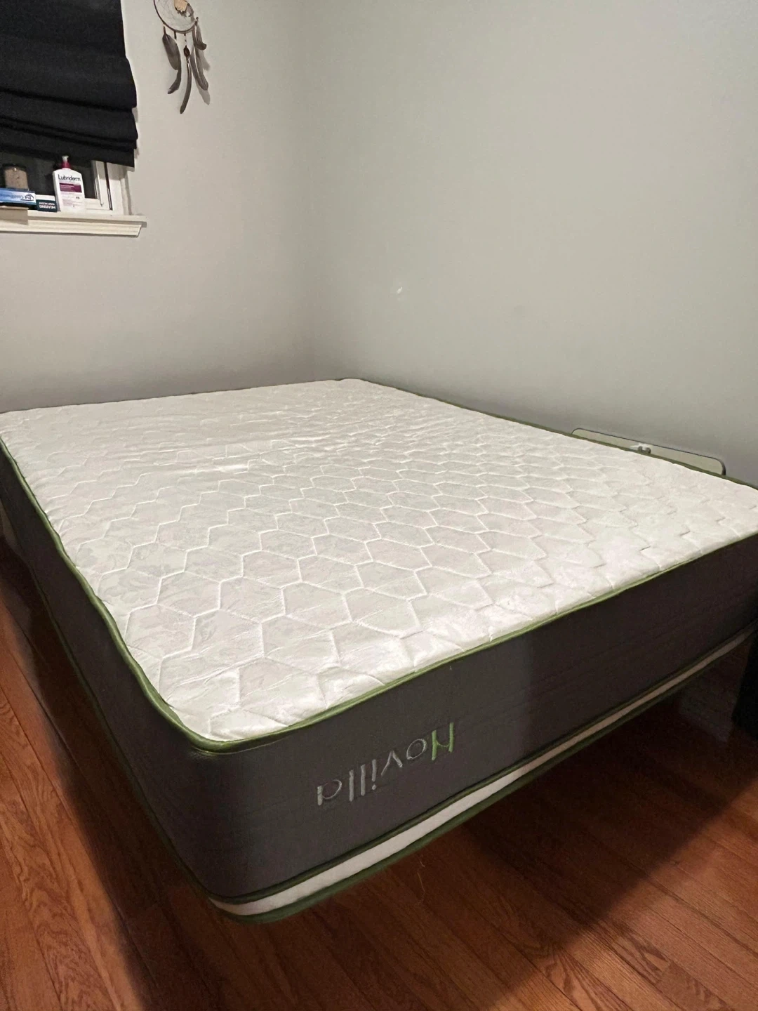 This is a Novilla mattress. It features a quilted top with a grey and green side panel design. Box spring included.
