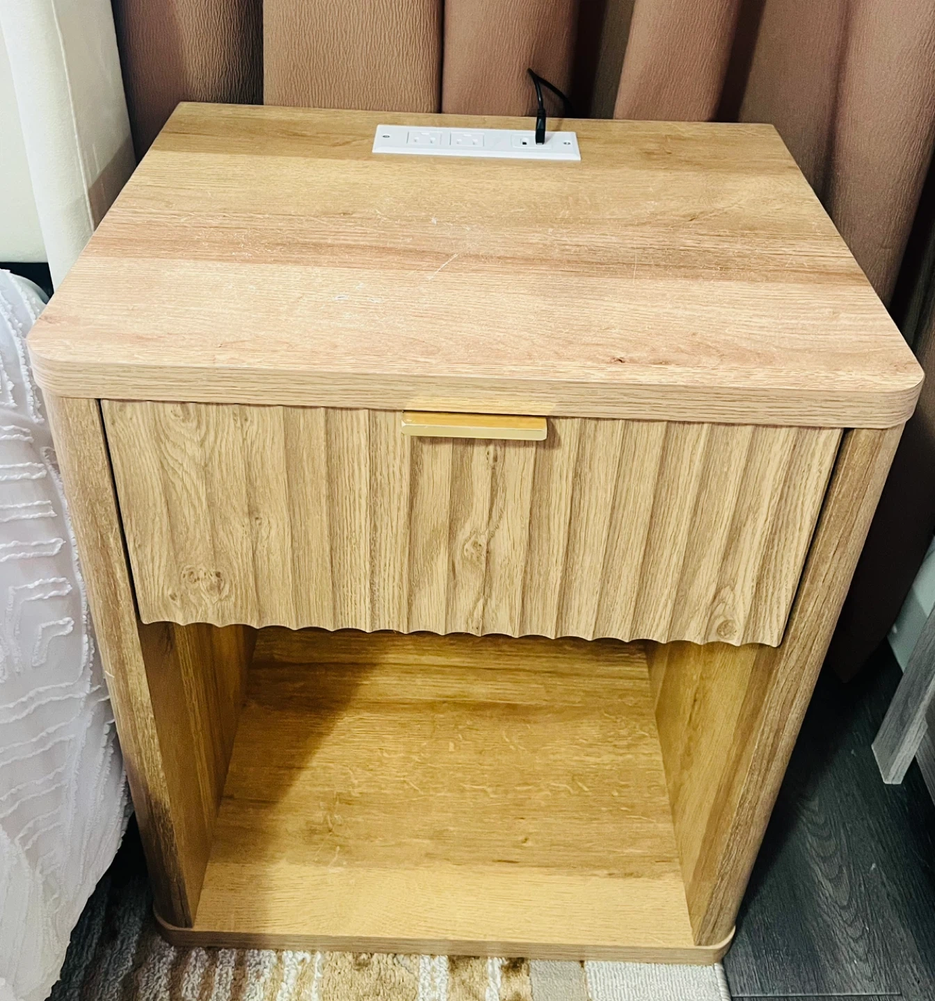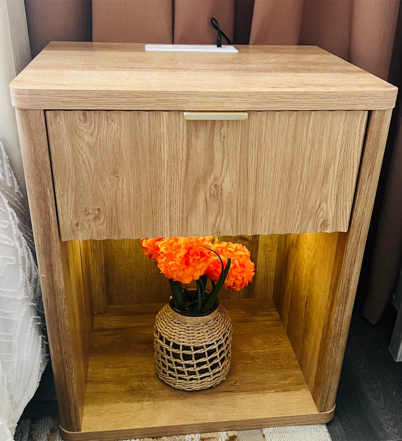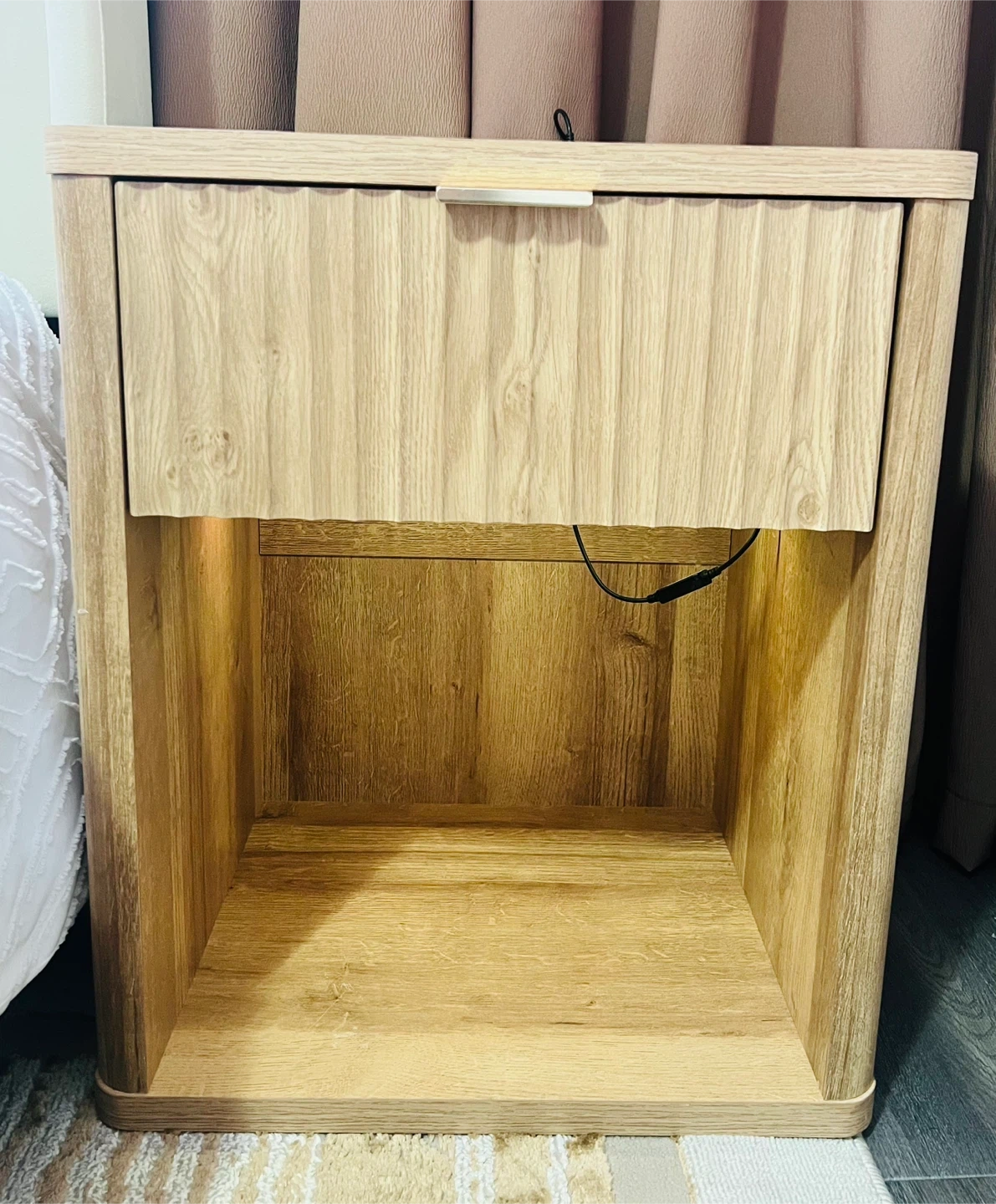 Modern nightstand/bedside table in excellent condition. Clean natural wood look with a built-in LED light under the drawer (multiple colors and brightness levels). Comes with a remote control, and the light can also be controlled through an app.