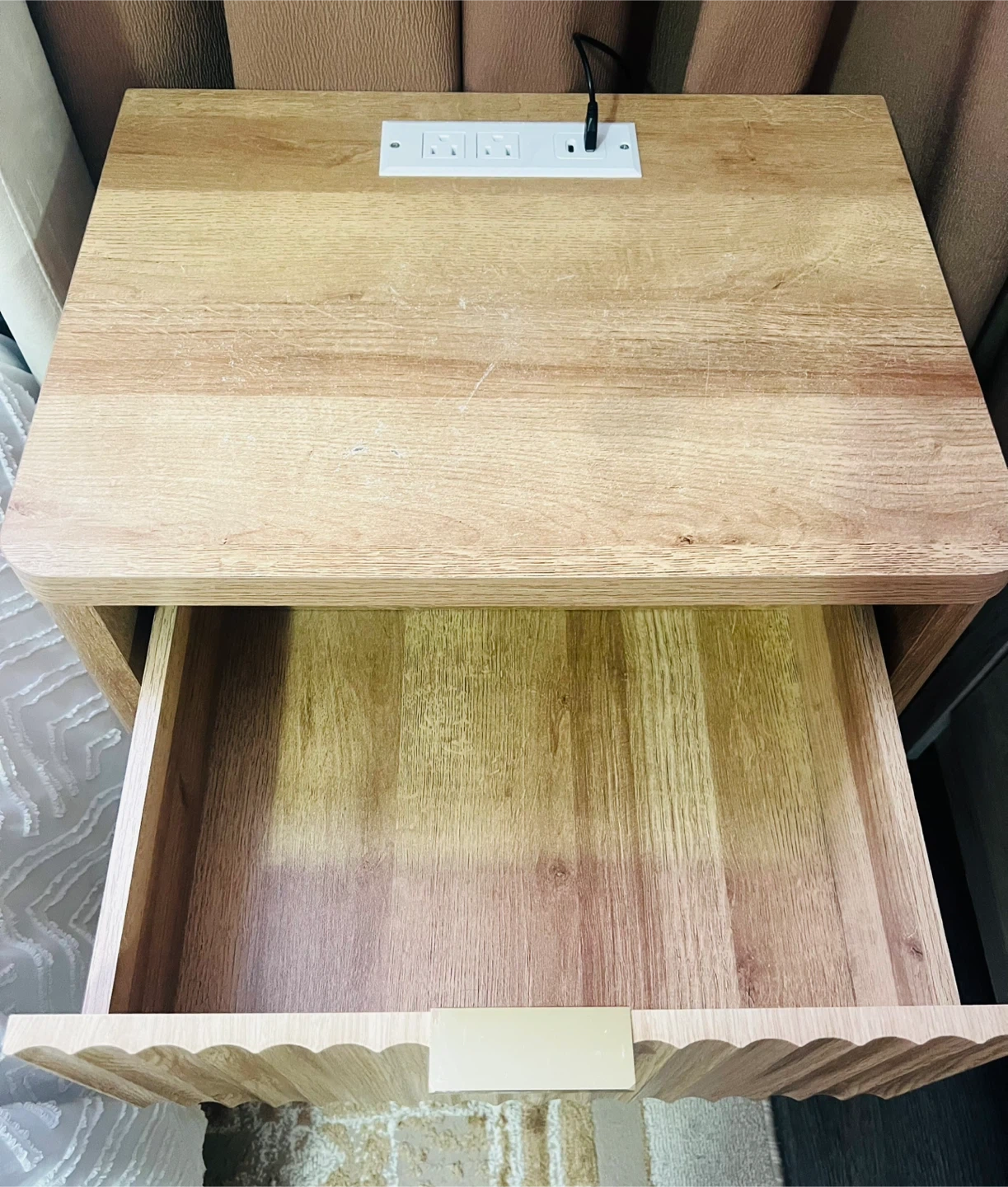 Includes 2 power outlets + 2 USB ports. One spacious drawer for storage and an open shelf at the bottom.