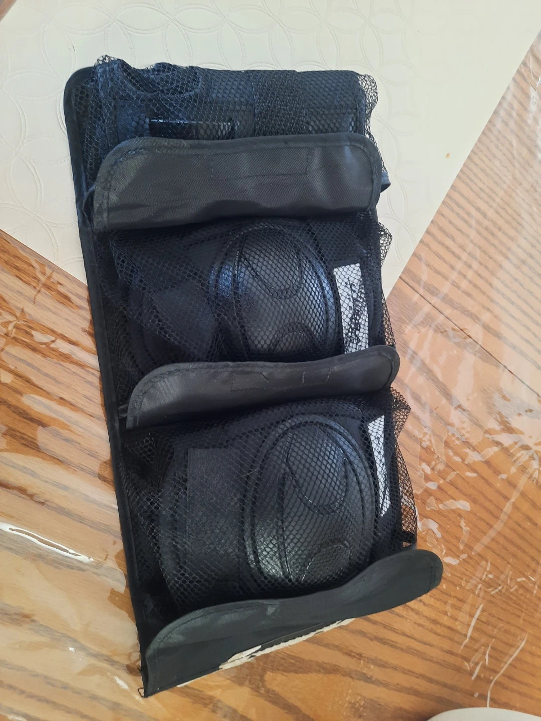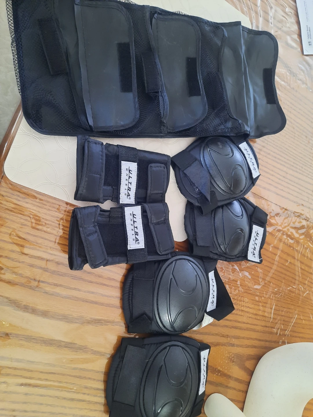 This is a black protective gear set by Ultra. It includes kids knee pads, elbow pads, and wrist guards. Everything comes in a mesh carrying bag.