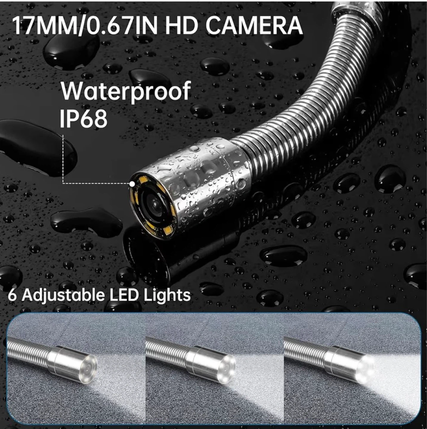 Video camera with 16G memory card. 17MM/0.67IN HD camera, waterproof IP68. Includes 6 adjustable LED lights. Comes with charger and screwdriver.