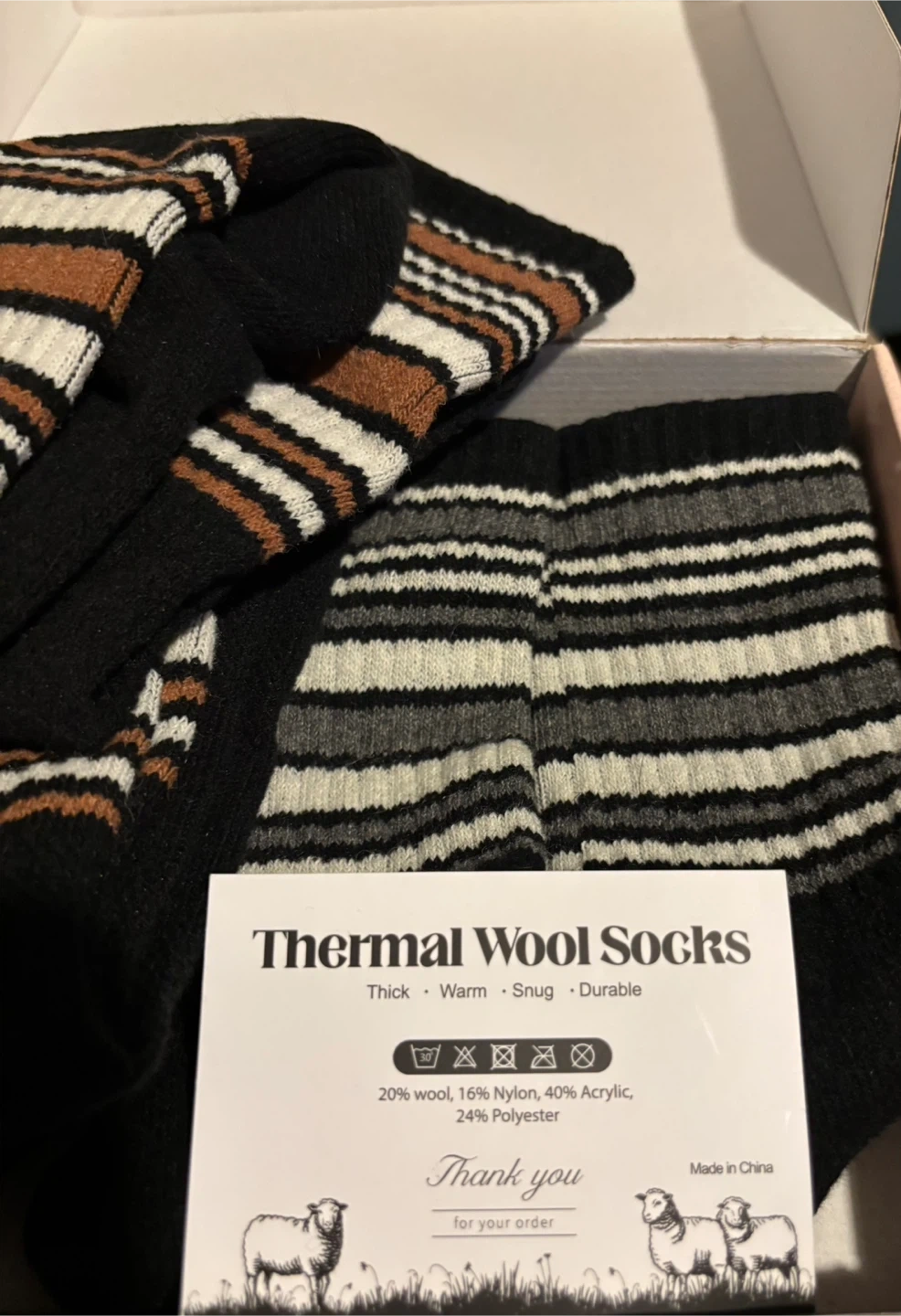 These thermal wool socks are designed to be thick, warm, snug, and durable. They're made with 20% wool, 16% nylon, 40% acrylic, and 24% polyester. These socks are ideal for keeping your feet cozy in colder weather!