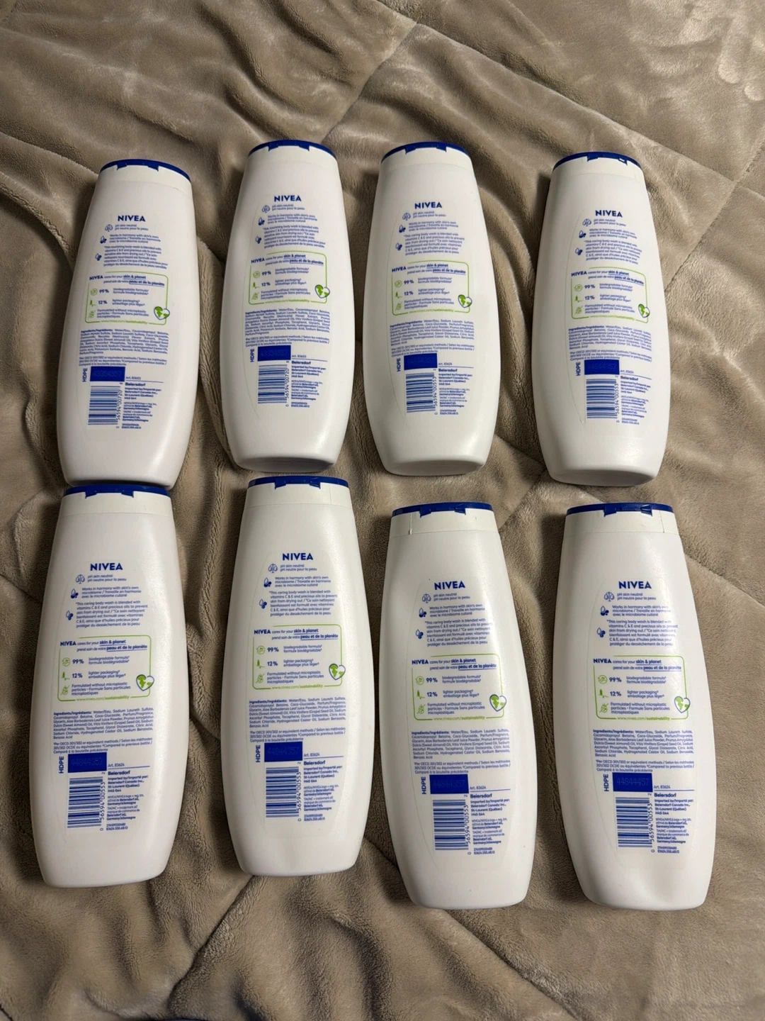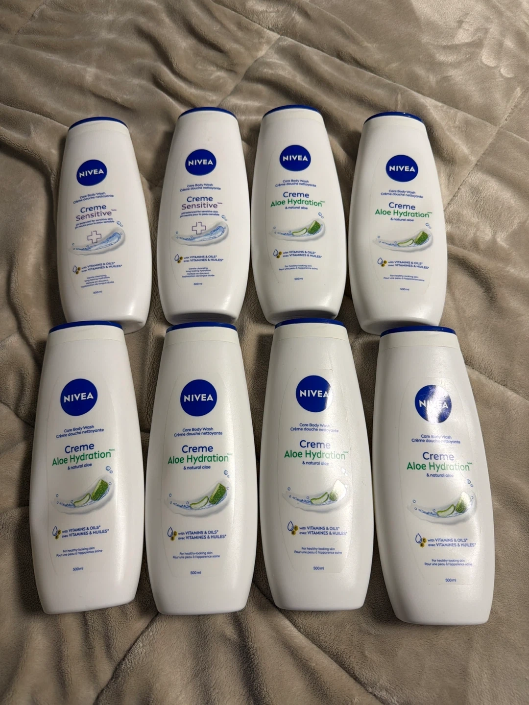 This lot includes four NIVEA Creme Sensitive Care Body Washes and four NIVEA Creme Aloe Hydration Body Washes. Each bottle contains 500ml. These are great for everyday use and are gentle on the skin. They come in large bottles, perfect for stocking up!