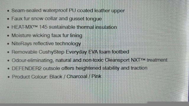 Bought these on November 4th. Original price was $160, I paid $120. I only wore them twice, but they're too big for me as I'm a size 6.5. These are a US size 8 or EU 41. They are very warm, rated for -40°C. The original box is ripped. The boots came with a couple of scuff marks but are in great condition overall. They felt too heavy and clunky for me, like hockey skates or snowboard boots. The tops are quite stiff, so you'll be walking more with your calves. Pickup is at Tower Hill Plaza on Bathurst in Richmond Hill only.