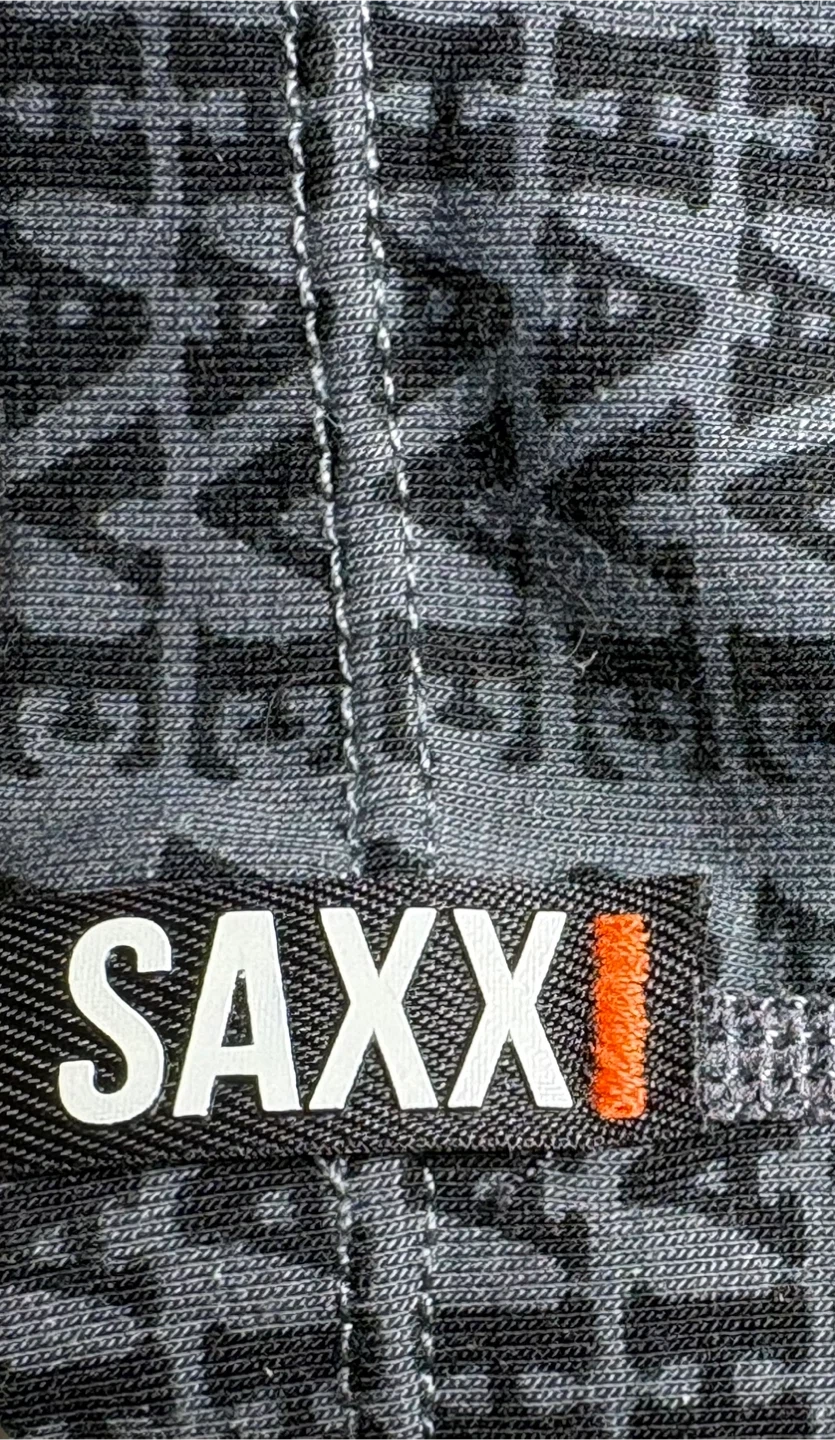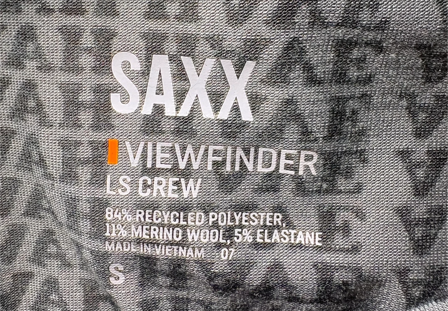 SAXX Viewfinder LS Crew long sleeve shirt with a "Have A Nice Day" pattern. It's made of 84% recycled polyester, 11% merino wool, and 5% elastane. Size is small with some stretch