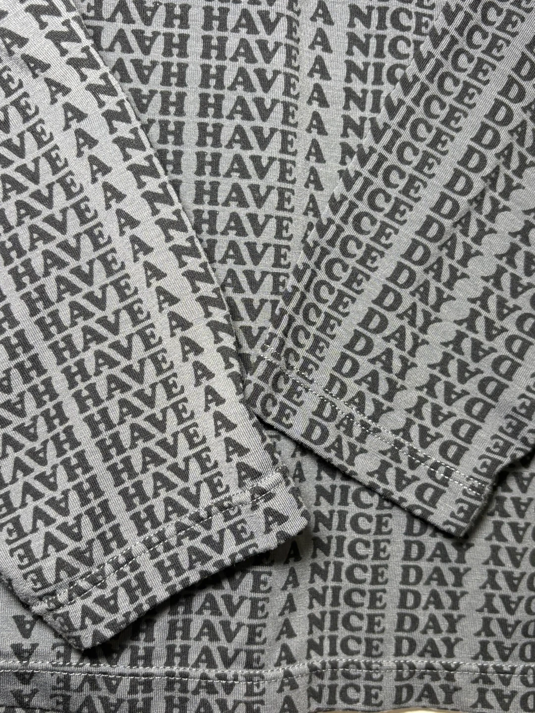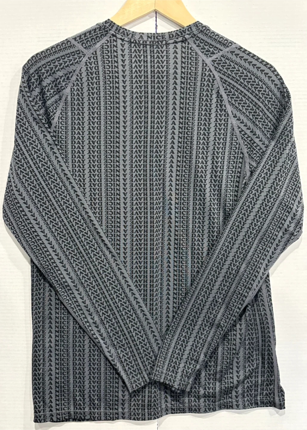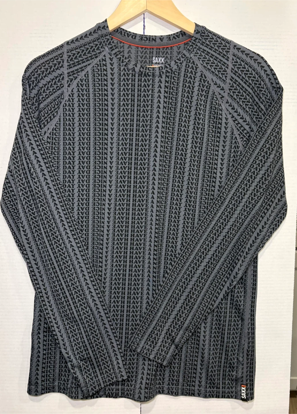 SAXX Viewfinder LS Crew long sleeve shirt with a "Have A Nice Day" pattern. It's made of 84% recycled polyester, 11% merino wool, and 5% elastane. Size is small with some stretch