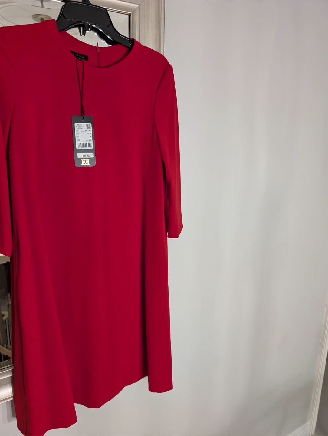 Escada women's dress in a vibrant cherry red. Size 36. Made in Romania. This classic style features 3/4 length sleeves and a flattering A-line silhouette.