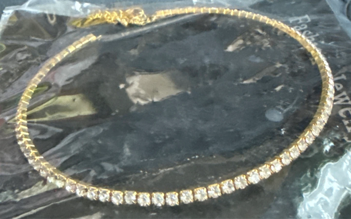 This gold-tone choker necklace is adorned with sparkling rhinestones. It features an adjustable chain for a comfortable fit. Perfect for adding a touch of glamour to any outfit!