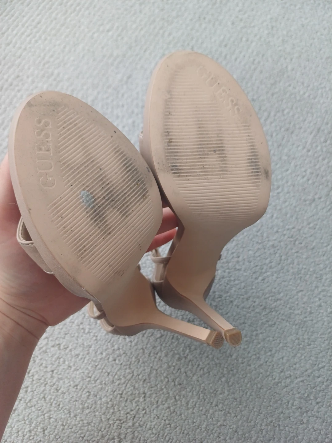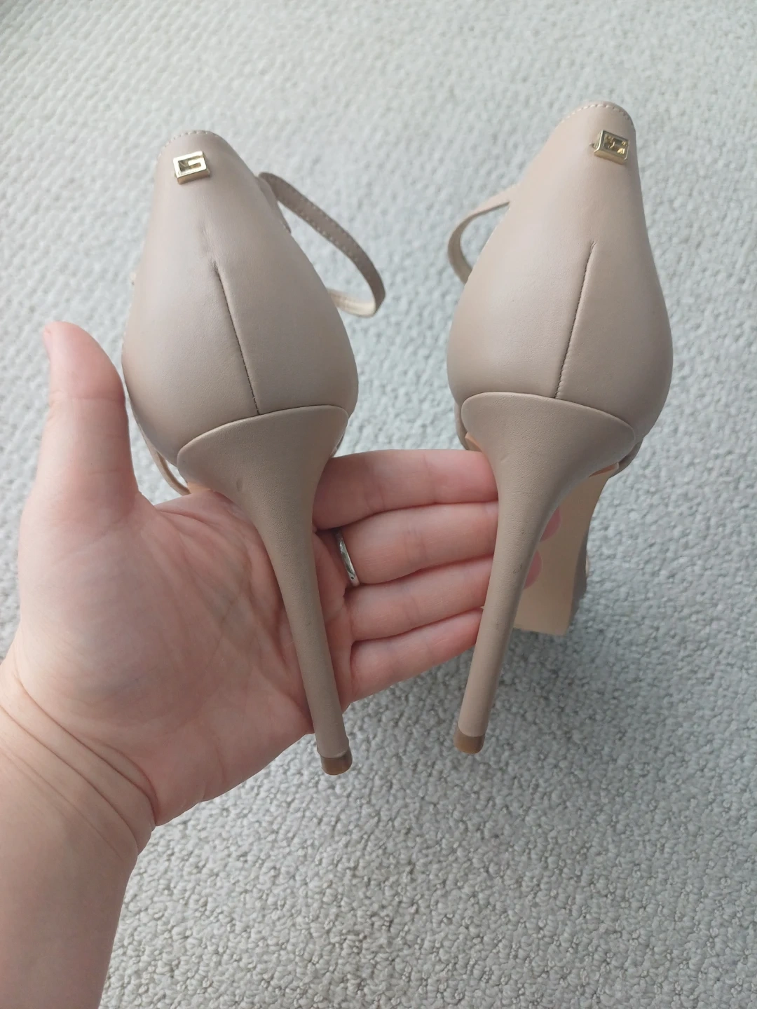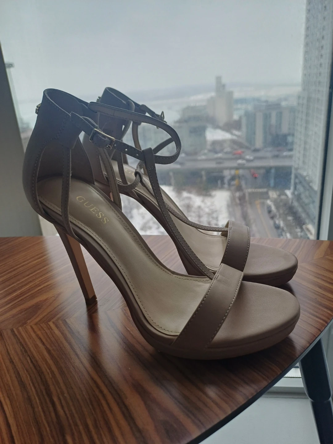 Guess heeled sandals in a nude colour. Features a t-strap design and adjustable ankle strap. They're a stylish choice for dressing up an outfit!