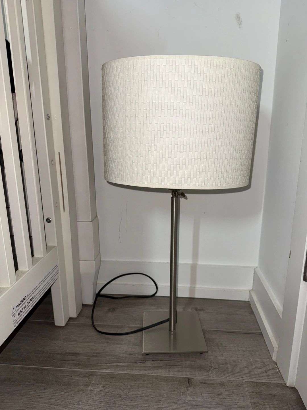 This night stand table lamp features a white textured drum shade for a clean look. Its brushed metal base and stem offer a modern appeal. It's suitable for adding ambient lighting to any room. Pick up by the Eaton Center!