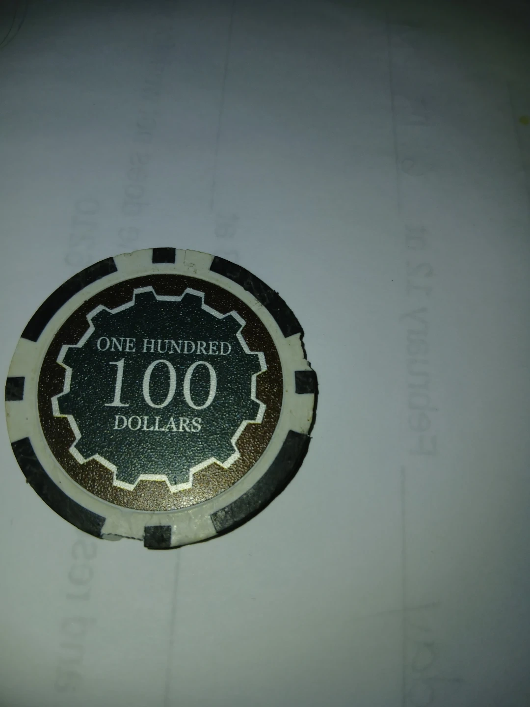 This is a poker chip marked with 'ONE HUNDRED 100 DOLLARS'. It has a geared edge design around the text. This chip is useful for casual games or as a prop.