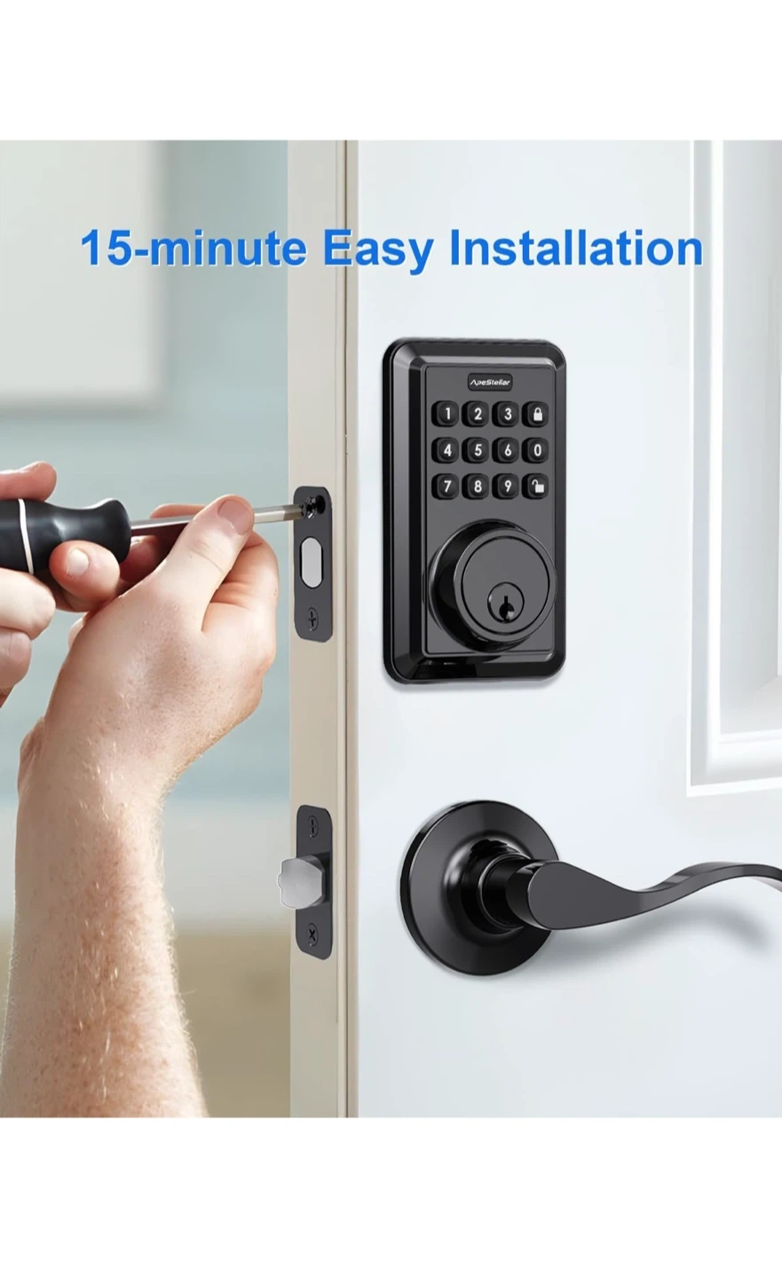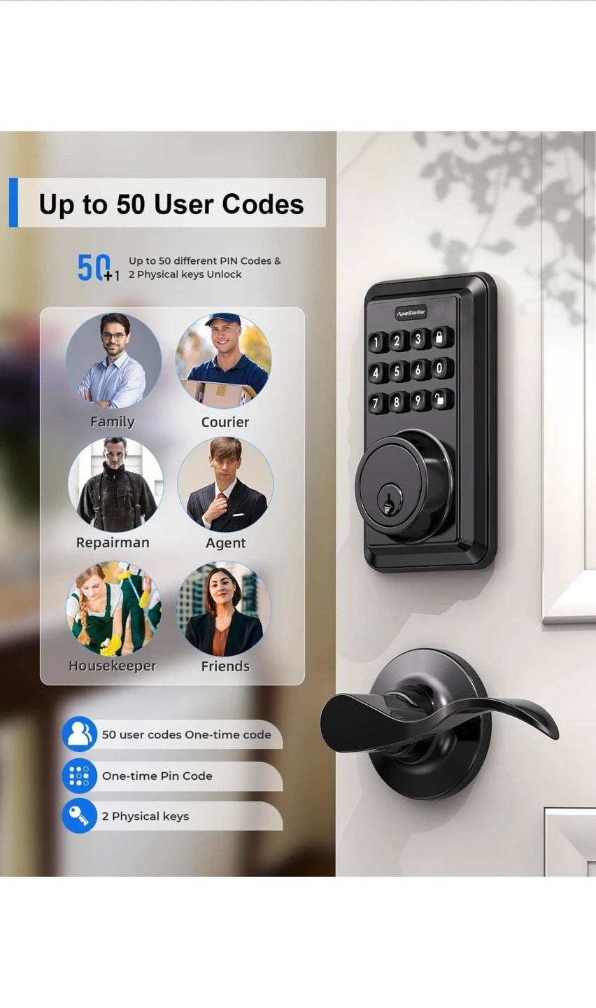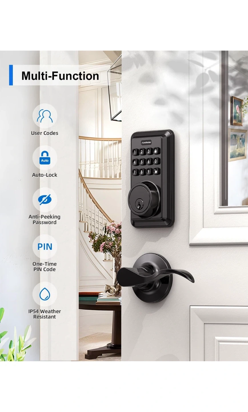 Selling an Apepaler digital door lock. It's designed for easy, 15-minute installation and fits most standard doors (suitable for 2-1/8"(54mm) door holes Backset: 2-3/8" or 2-3/4"(60mm or 70mm)). Key features include: - Multi-function with user codes - Auto-lock - Anti-peeking password - One-time PIN code - IP54 weather resistance It supports up to 50 user codes and includes 2 physical keys for unlocking