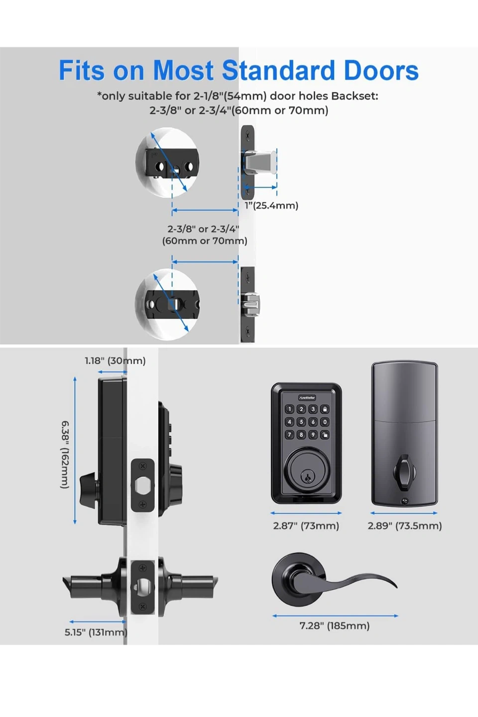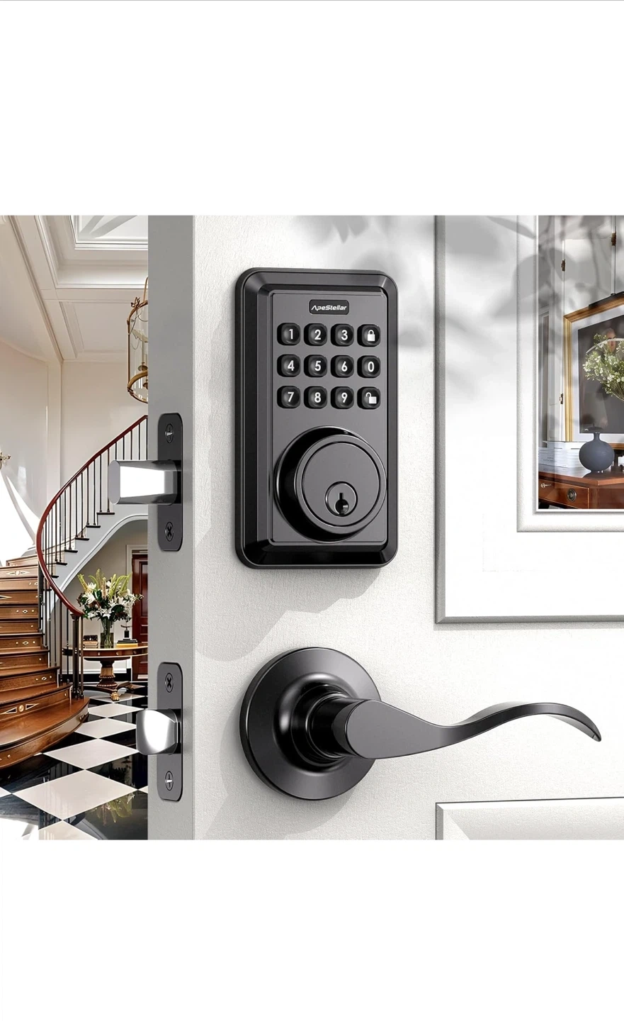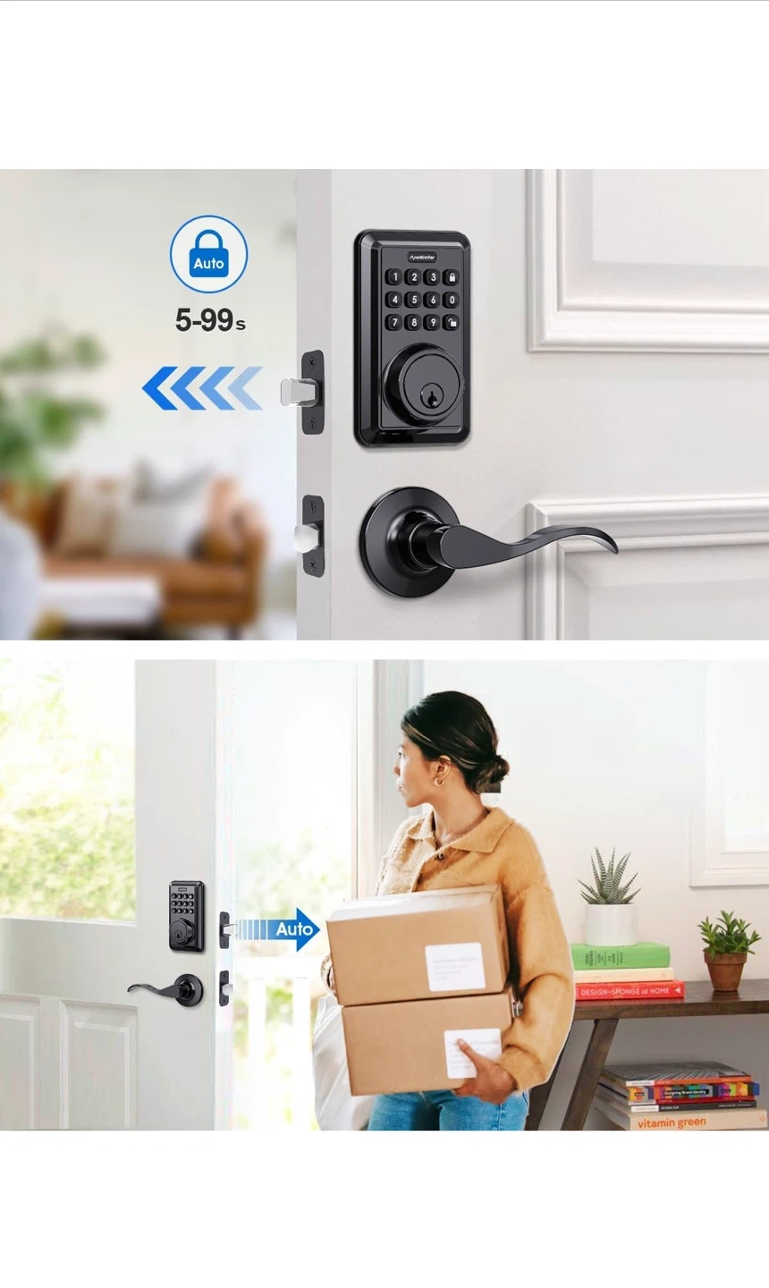 Selling an Apepaler digital door lock. It's designed for easy, 15-minute installation and fits most standard doors (suitable for 2-1/8"(54mm) door holes Backset: 2-3/8" or 2-3/4"(60mm or 70mm)). Key features include: - Multi-function with user codes - Auto-lock - Anti-peeking password - One-time PIN code - IP54 weather resistance It supports up to 50 user codes and includes 2 physical keys for unlocking
