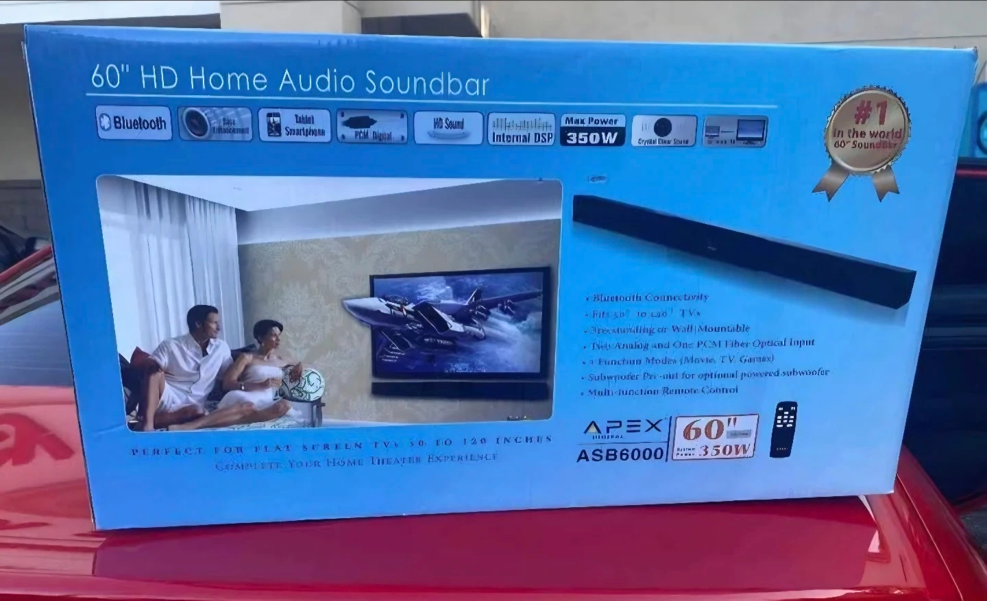 10Selling an Apex ASB6000 60" Home Audio Soundbar. It's in great condition and comes with its original box! Key features include: - Bluetooth connectivity - Ability to be wall-mounted - Two analog and one PCM fiber optical input - Full-function remote control - Subwoofer pre-out for optional powered subwoofer Perfect for flat screen TVs 30 to 120 inches
