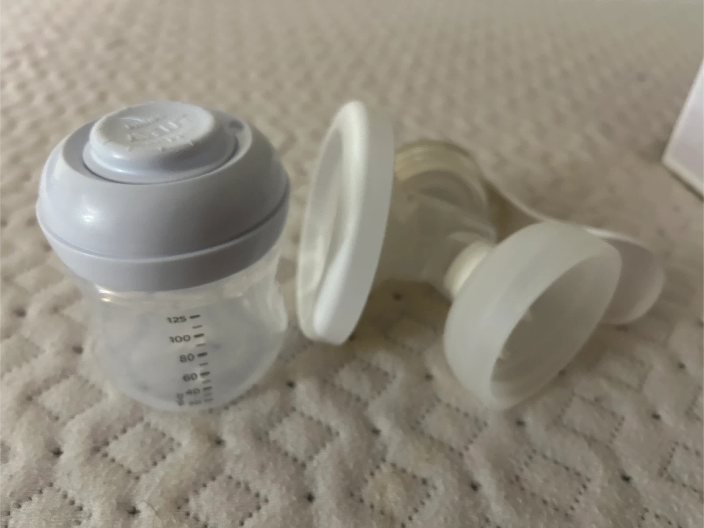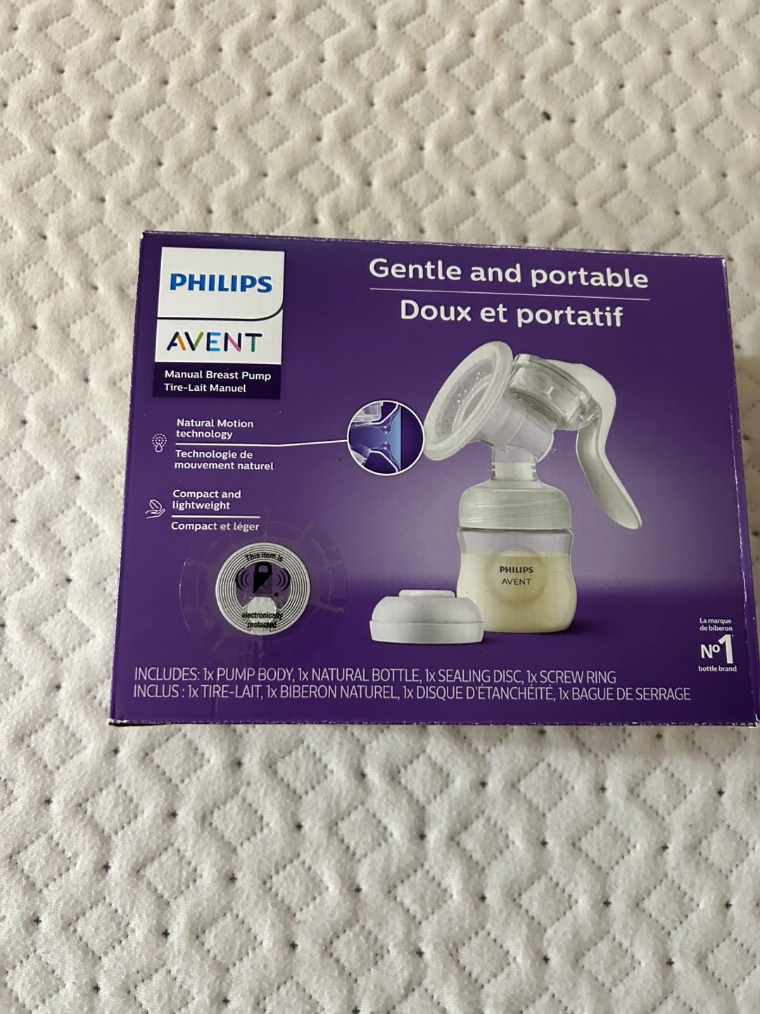 This is a Philips Avent manual breast. It includes the pump body, a natural bottle, a sealing disc, and a screw ring. Its compact and lightweight design makes it easy to use and transport. Used just once.