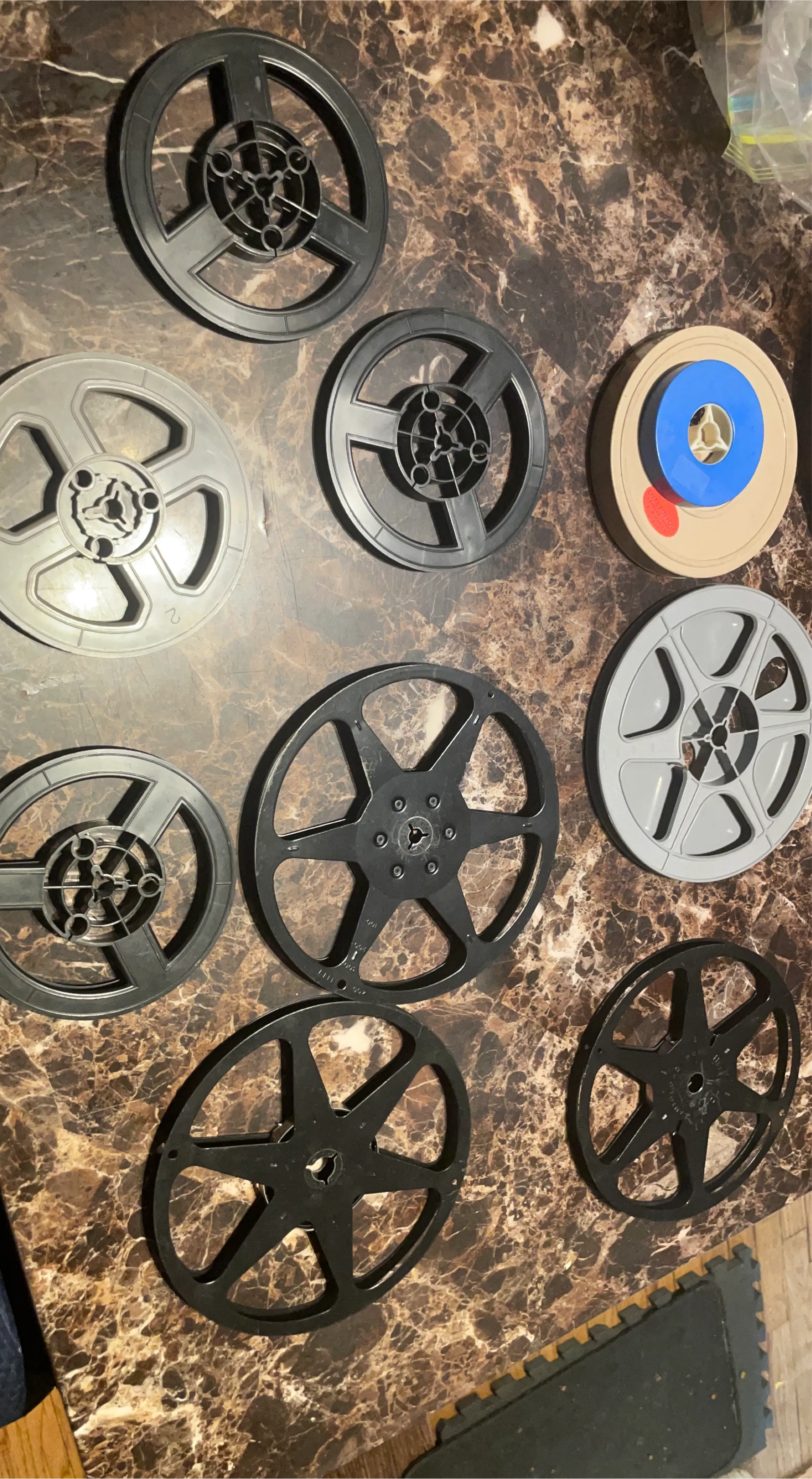 This is a lot of 9 film reels in various sizes and colors, including black and gray. Some reels have tape and a red and blue indicator. They appear to be made of plastic.