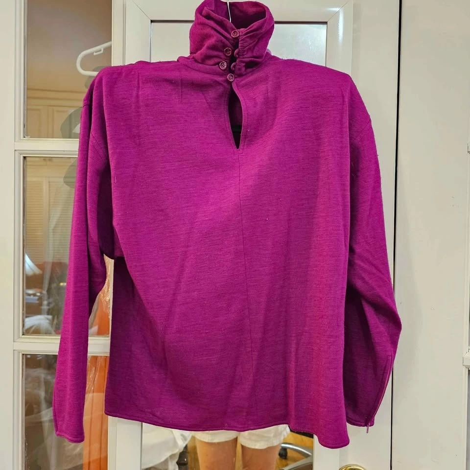 Ungaro at Bergdorf Goodman blue-violet bargello long-sleeve blouse with high turtleish neck. Sleeves are zippered at end. Removable shoulder pads.